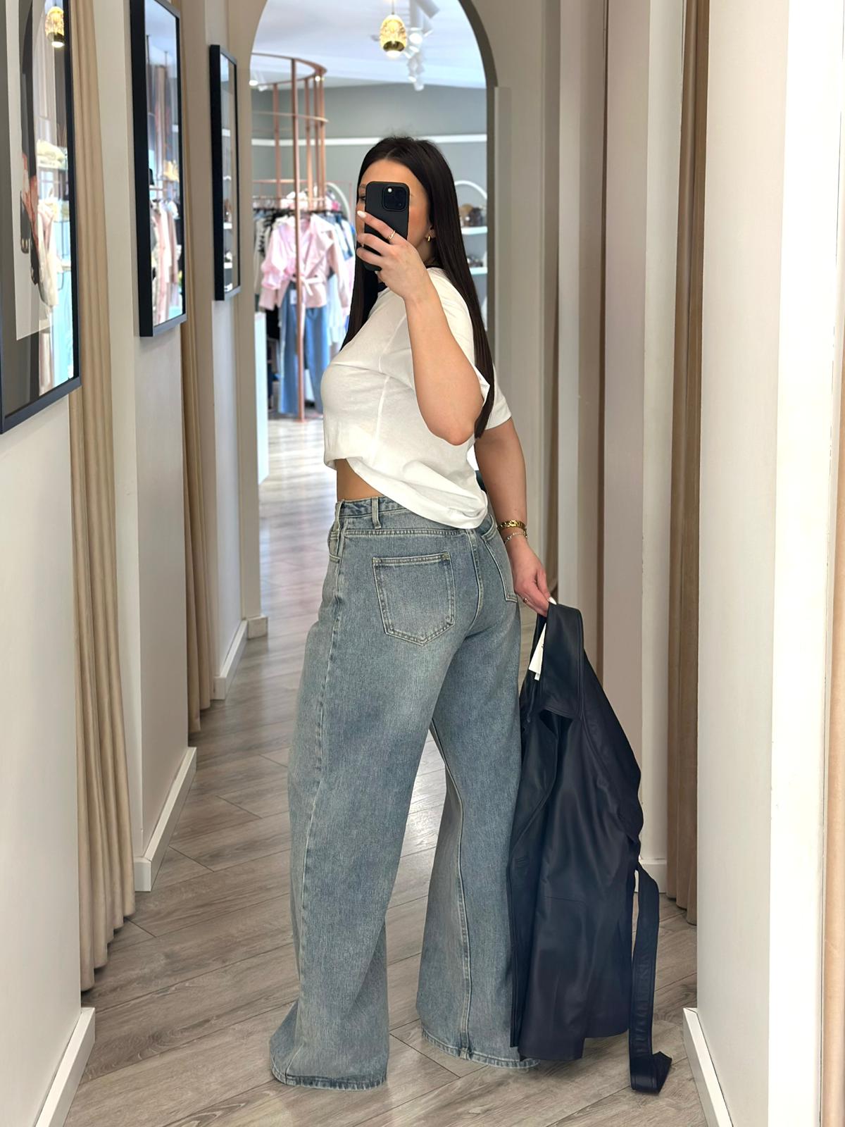 A ganga tem lavagem suave e acabamento cuidado, com bolsos funcionais e costuras em contraste que mantêm o carácter urbano da peça. Versátil e atual, funciona na perfeição com tops ajustados, camisas estruturadas ou blazers mais curtos, permitindo destacar o detalhe da cintura.