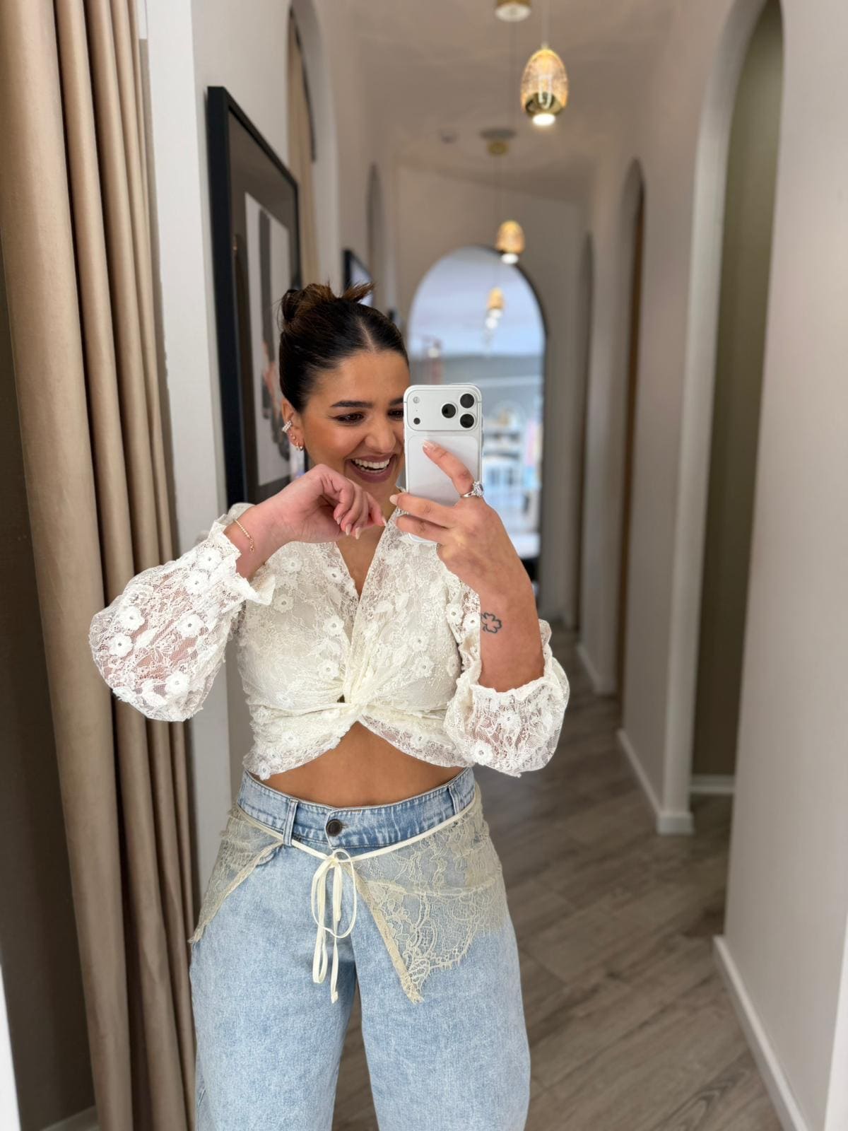 A cintura conta ainda com presilhas para cinto, fecho frontal com botão e bolsos funcionais, mantendo a estética clássica da ganga enquanto introduz um detalhe mais romântico e diferenciador.