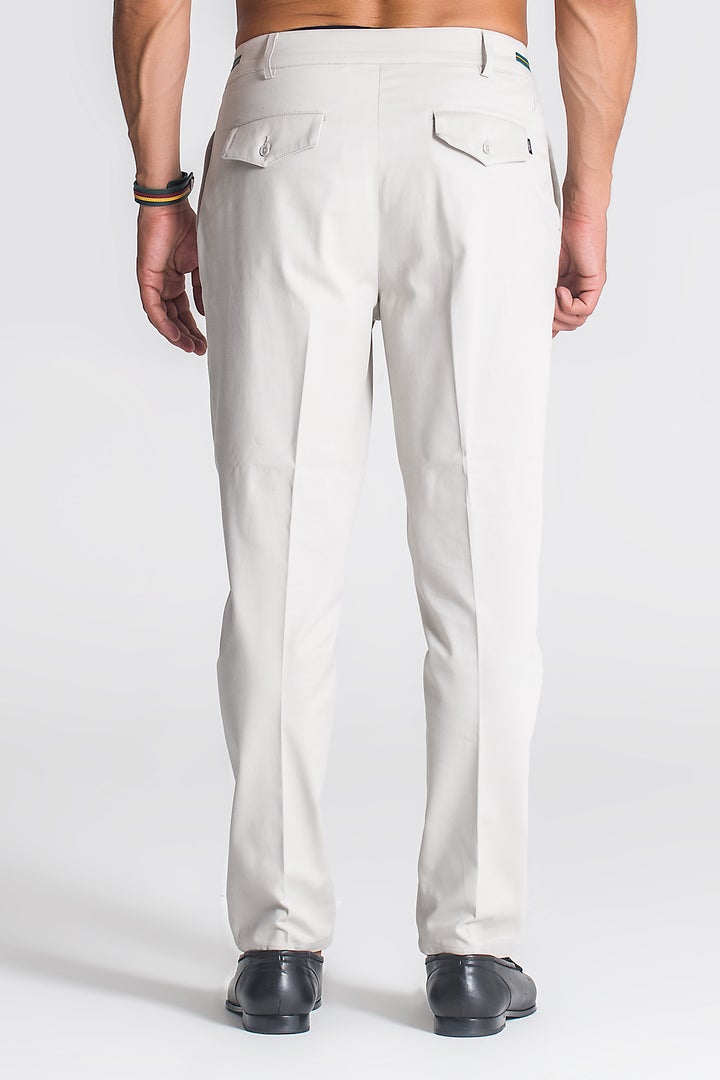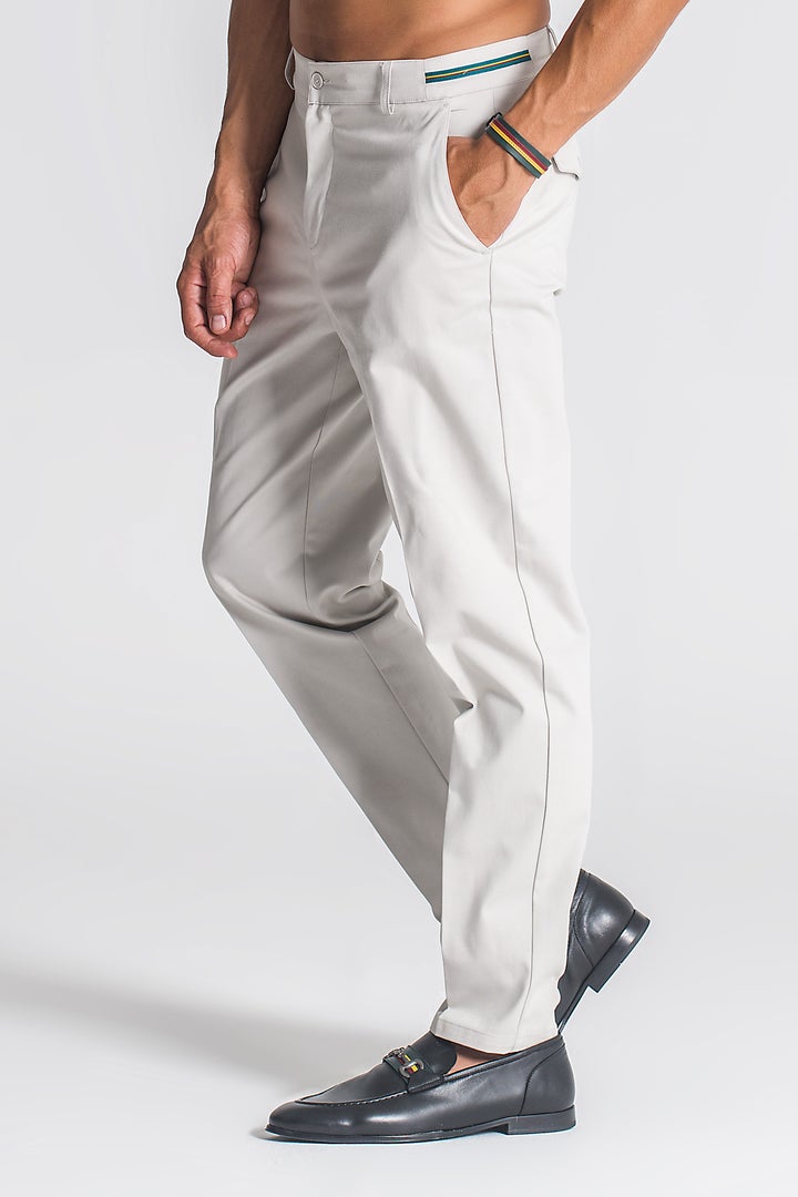 Calça cinza claro de corte clean e contemporâneo, ideal para um look casual cuidado com um toque sofisticado. Confeccionada em tecido de algodão com elastano, garante conforto, respirabilidade e liberdade de movimento ao longo do dia.
