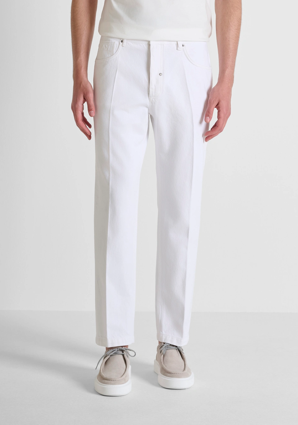 A tonalidade branca intensa reforça a elegância da peça e destaca o corte depurado, com cinco bolsos funcionais, presilhas clássicas e costuras subtis que acompanham a construção. A linha Josh distingue-se pelo fitting equilibrado, pensado para valorizar a silhueta com um caimento atual e descontraído.
