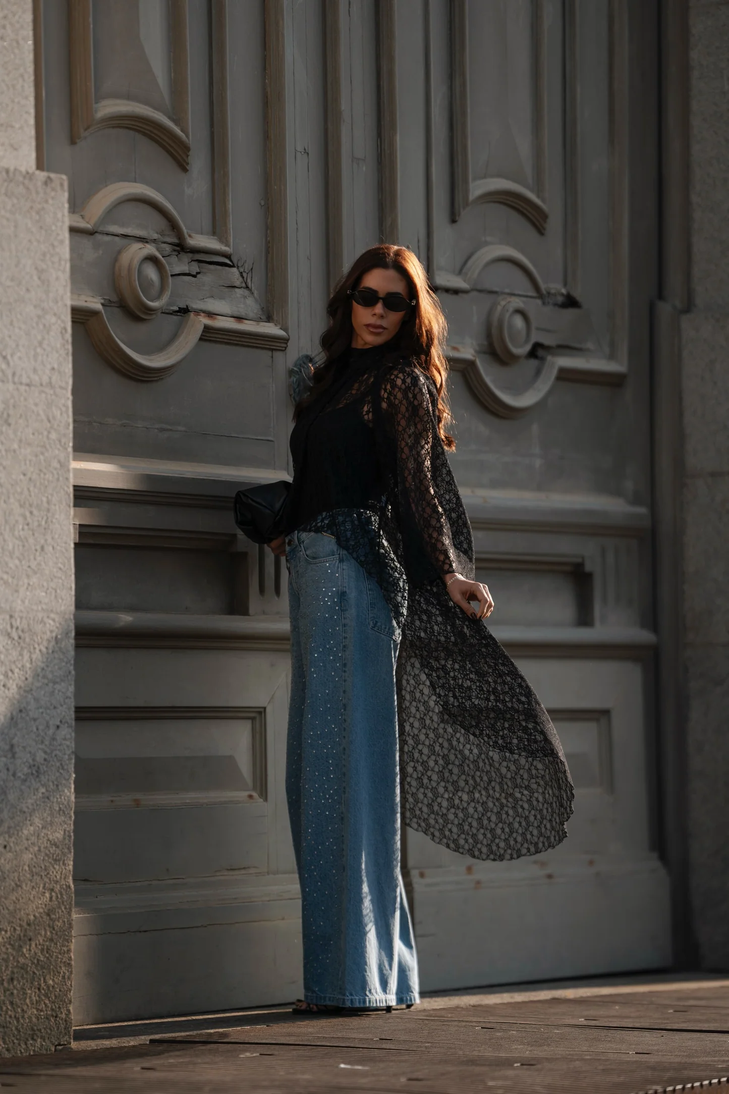 Moderna e cheia de personalidade, esta calça denim destaca-se pelos detalhes em brilhantes que elevam um clássico a um nível mais sofisticado.