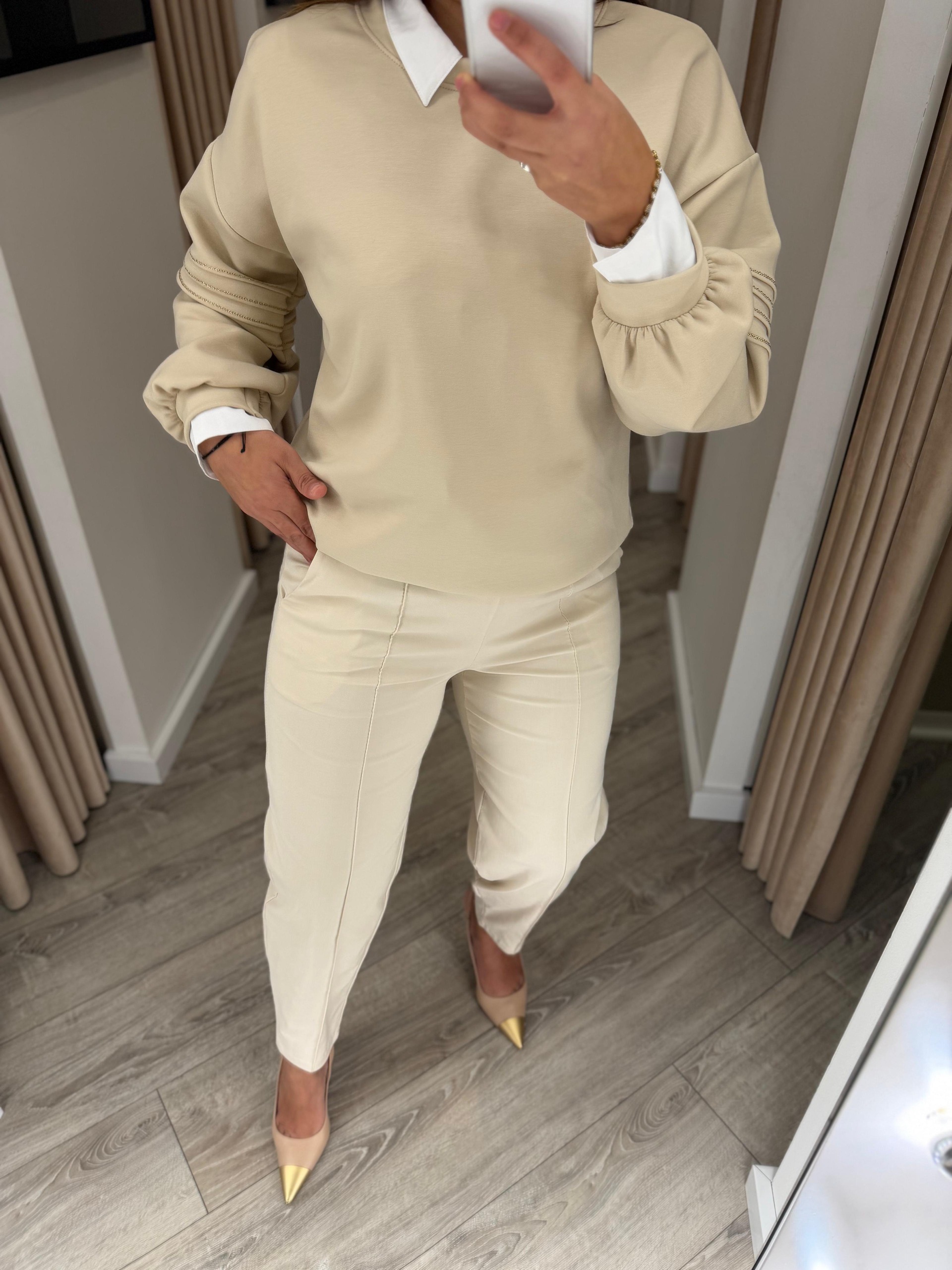 O tecido suave e fluido proporciona um cair elegante, tornando esta calça ideal tanto para looks casuais como para combinações mais sofisticadas. O tom bege acrescenta luminosidade ao visual e permite múltiplas conjugações, tornando-a uma peça versátil e indispensável no guarda-roupa feminino.