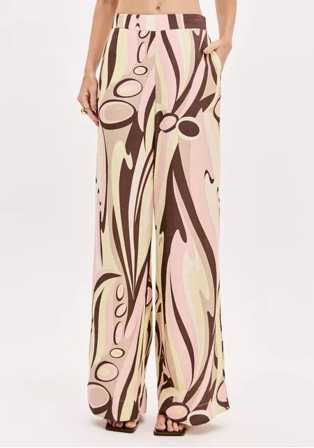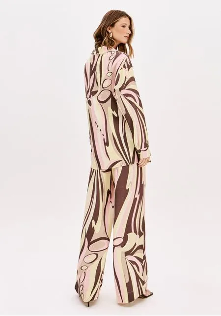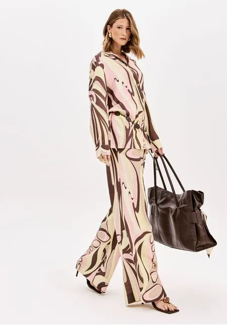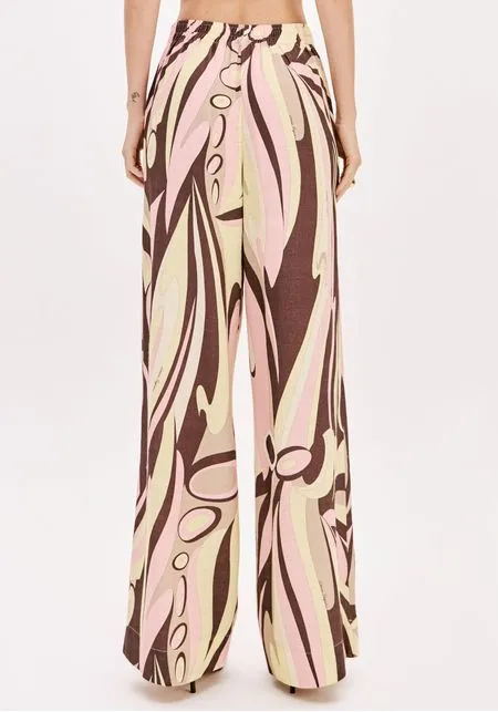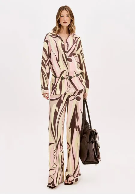 Calça fluida de cintura subida com padrão abstrato em tons de rosa suave, amarelo manteiga, bege e castanho chocolate, criando um efeito artístico e contemporâneo. A silhueta é ampla e elegante, com perna larga que alonga a figura e confere movimento natural a cada passo.