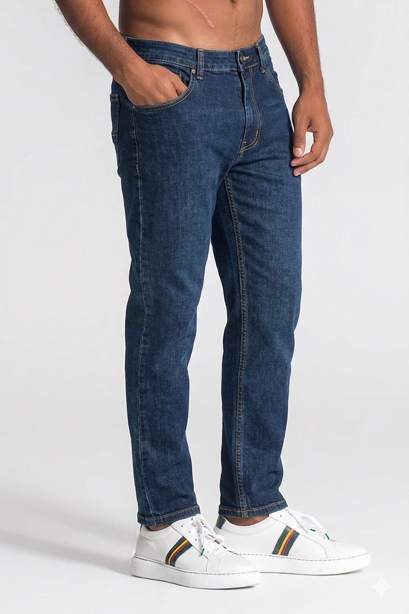 Calça de ganga azul escuro de corte moderno e versátil, ideal para um look casual com um toque sofisticado. Confeccionada em algodão (99%) com 1% elastano, proporciona conforto, flexibilidade e um ajuste natural ao corpo.