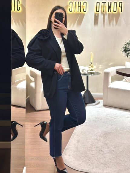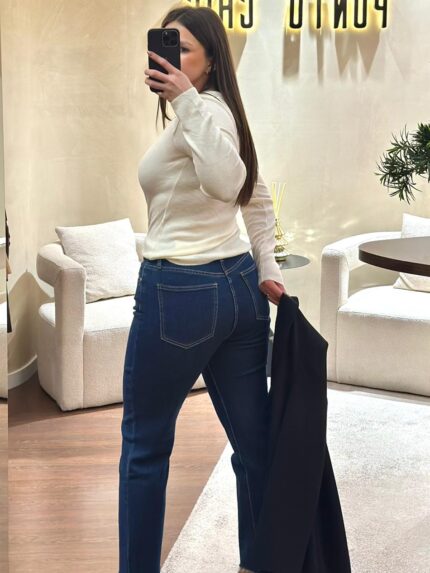 O design inclui cintura média, cinco bolsos tradicionais e lavagem azul média com ligeiros desgastes que dão profundidade ao tecido. A perna de corte recto, com comprimento cropped, cria uma silhueta atual e versátil, perfeita para calçado raso ou botas de cano curto. Na parte de trás, os bolsos quadrados reforçam o estilo casual da peça, mantendo um equilíbrio entre modernidade e funcionalidade.