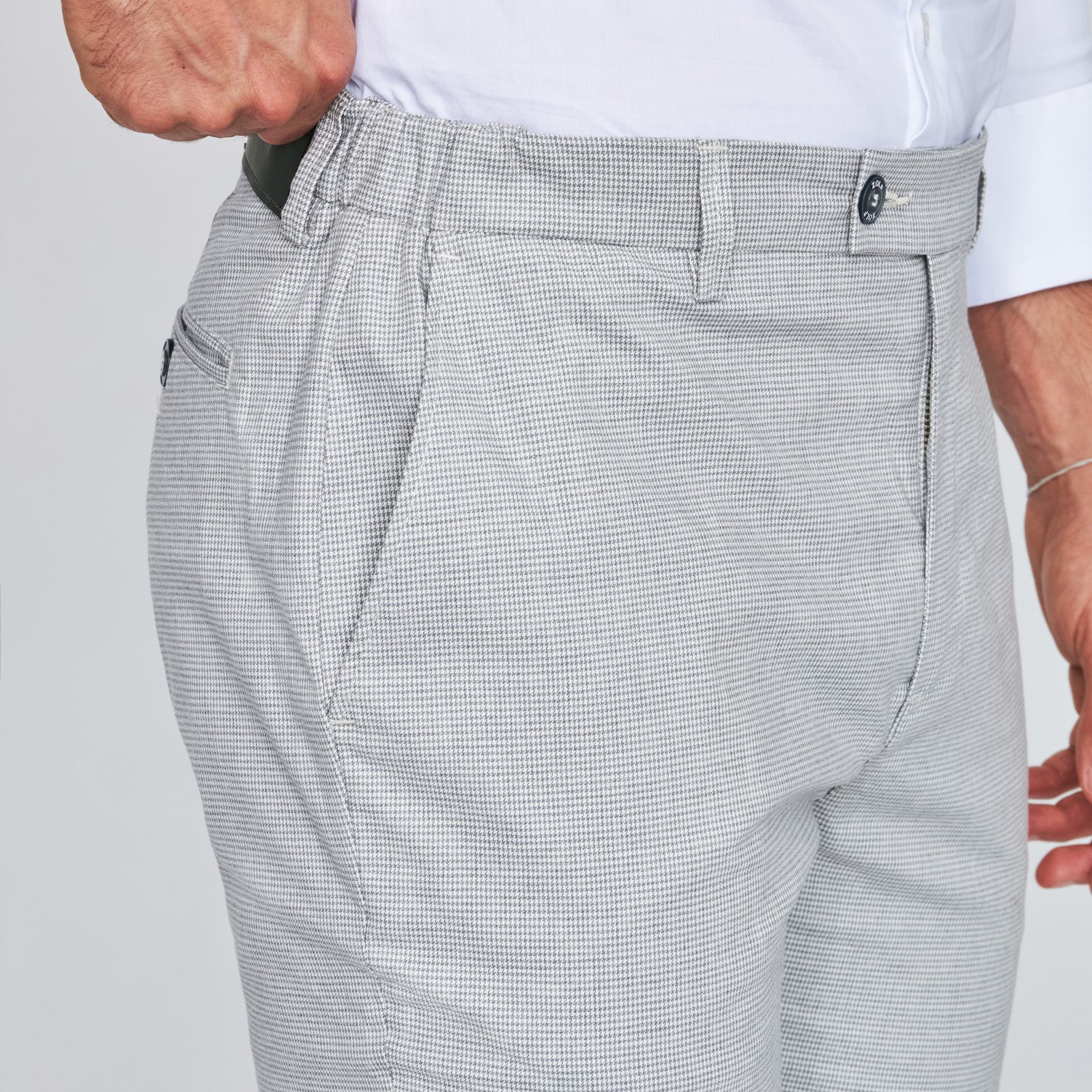 Confortável, moderna e fácil de combinar — esta calça da ZOLF apresenta um discreto padrão em tons de cinza que eleva qualquer look.
