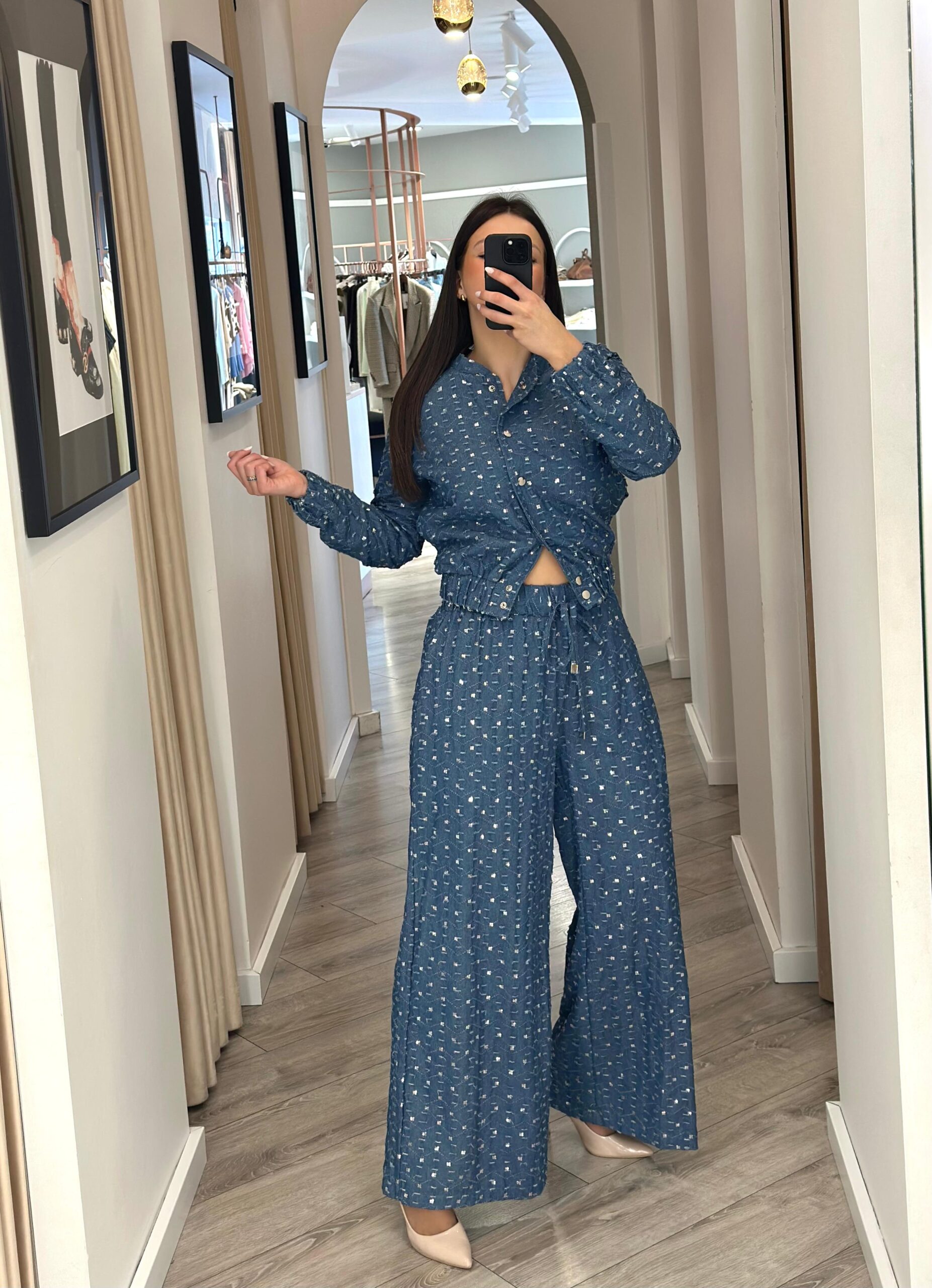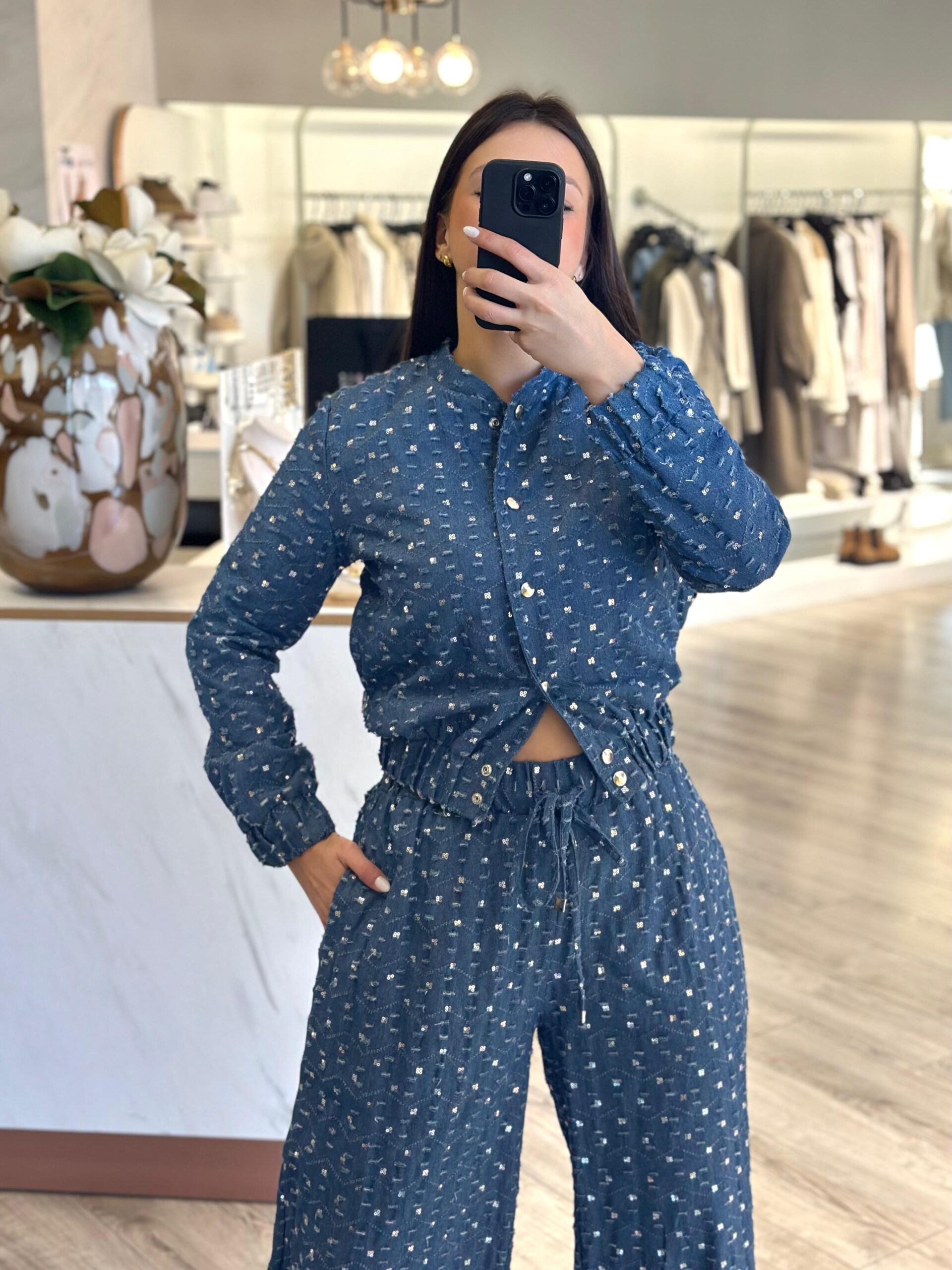 Com cintura elástica e corte fluido, estas calças oferecem liberdade de movimentos e um caimento elegante, tornando-se perfeitas tanto para looks casuais como para coordenados mais arrojados. O tom azul com aplicações cintilantes cria um efeito visual sofisticado, ideal para destacar o teu estilo com simplicidade e personalidade.