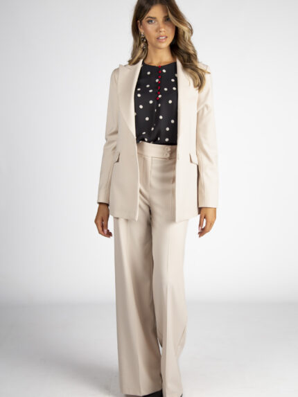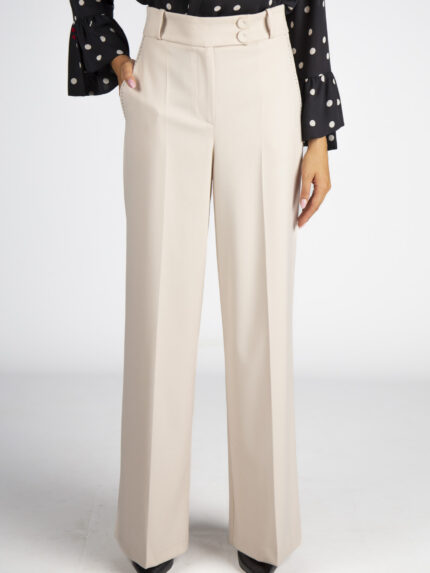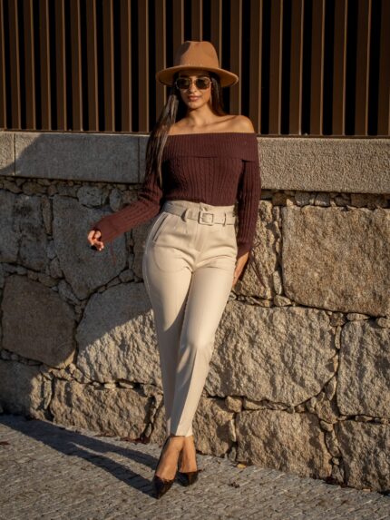 O modelo apresenta cintura subida com pregas, cinto em tecido a condizer e perna de corte afunilado, que alonga a silhueta e confere um ar refinado. Os detalhes estruturados e a versatilidade do tom neutro fazem desta calça uma peça prática e fácil de conjugar em diferentes looks.