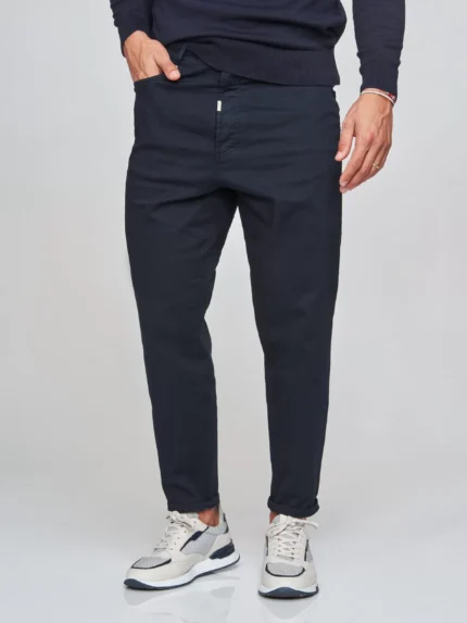 Calça clássica de malha com pinças. Bolsos de vivo nas laterais da frente e nas costas. Bordado à cor da peça nas costas. Tecido estampado (popelina orgânica com acabamento seda) alusivo ao conceito da coleção no saco dos bolsos.