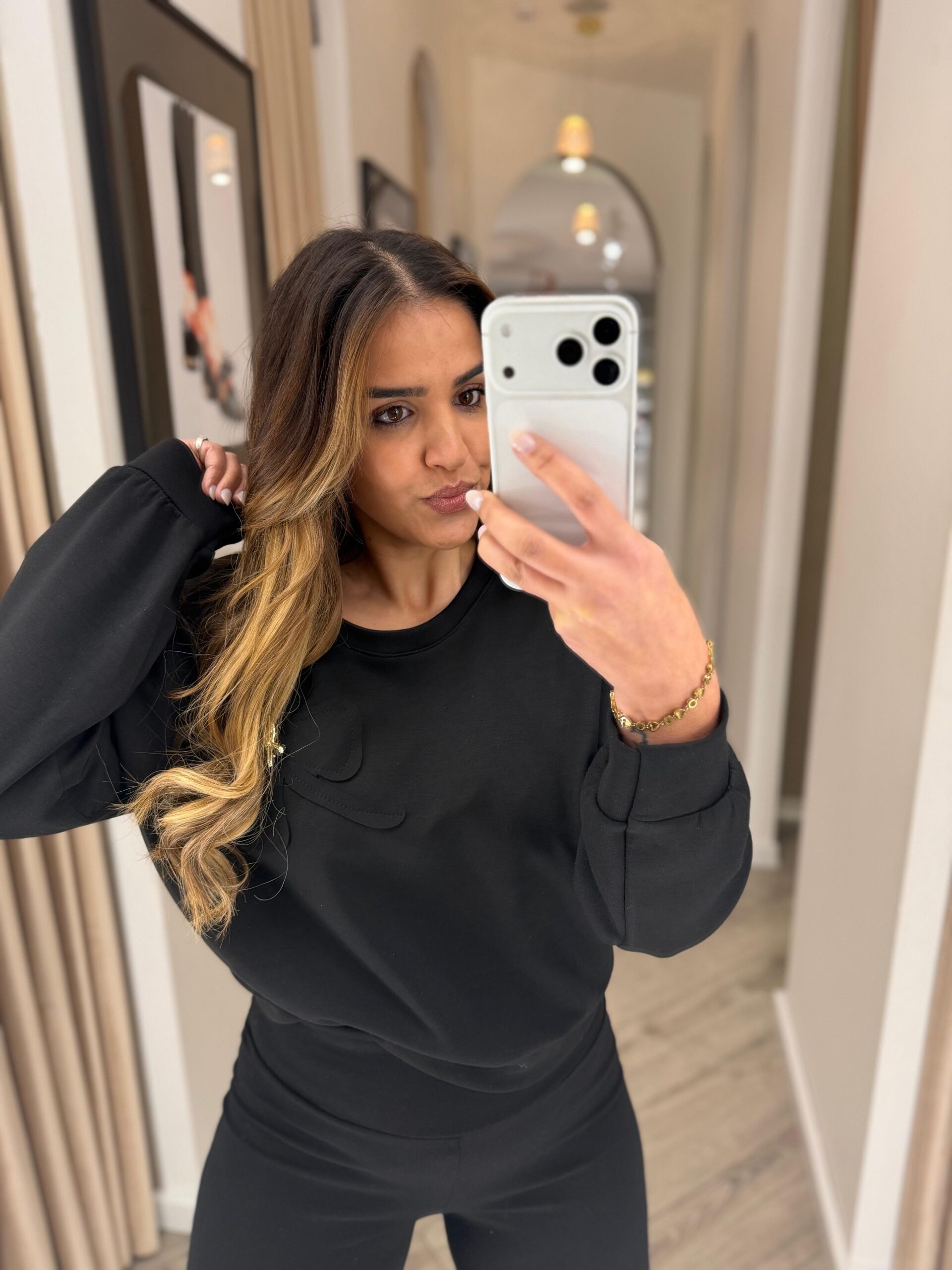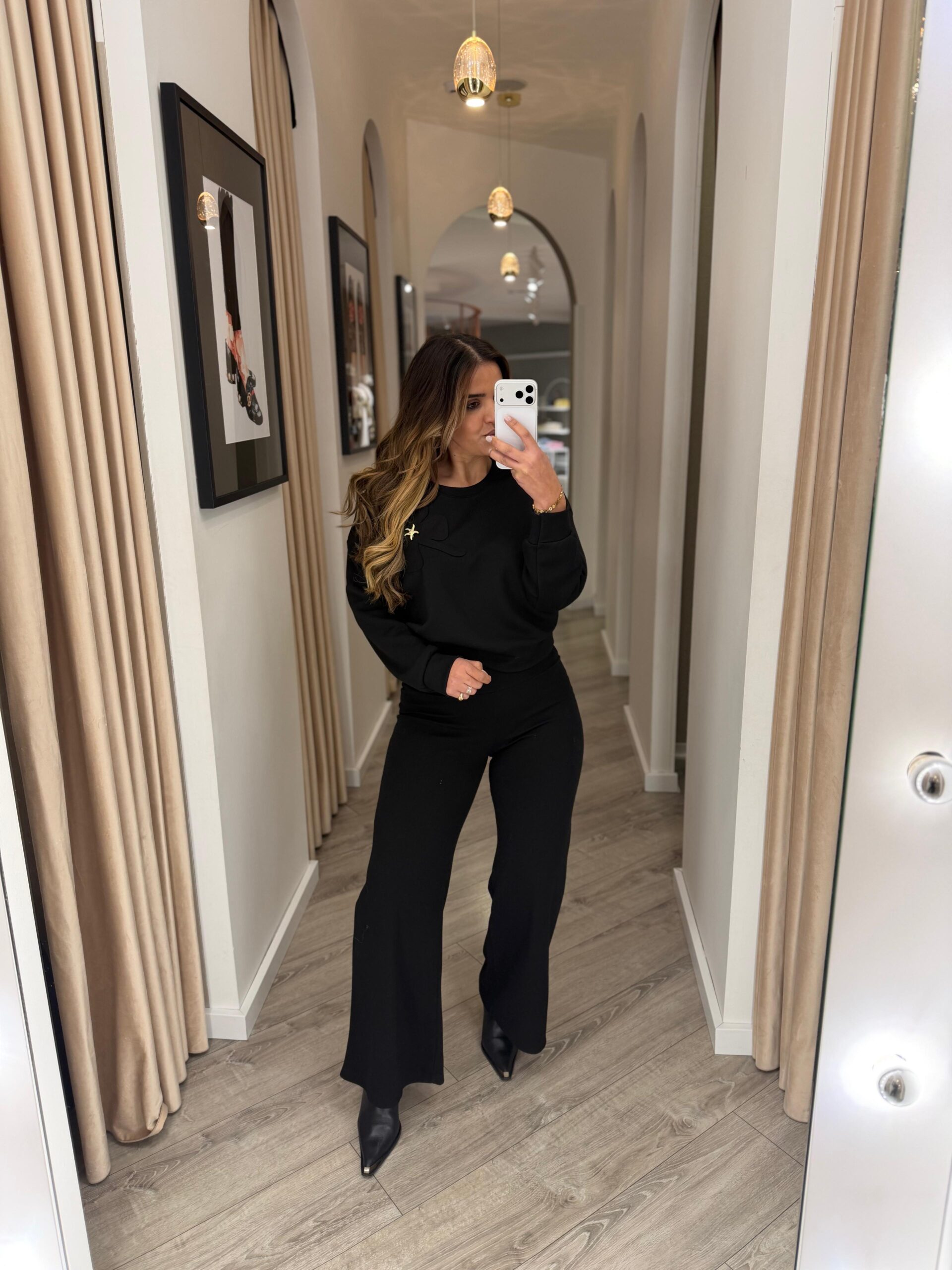 Esta calça preta da Ponto Chic destaca-se pelo seu design elegante e intemporal, ideal para quem procura conforto sem abdicar de uma imagem cuidada e sofisticada. O corte fluido e amplo cria um movimento natural ao caminhar, enquanto a cintura subida proporciona um ajuste favorecedor que alonga visualmente a silhueta.