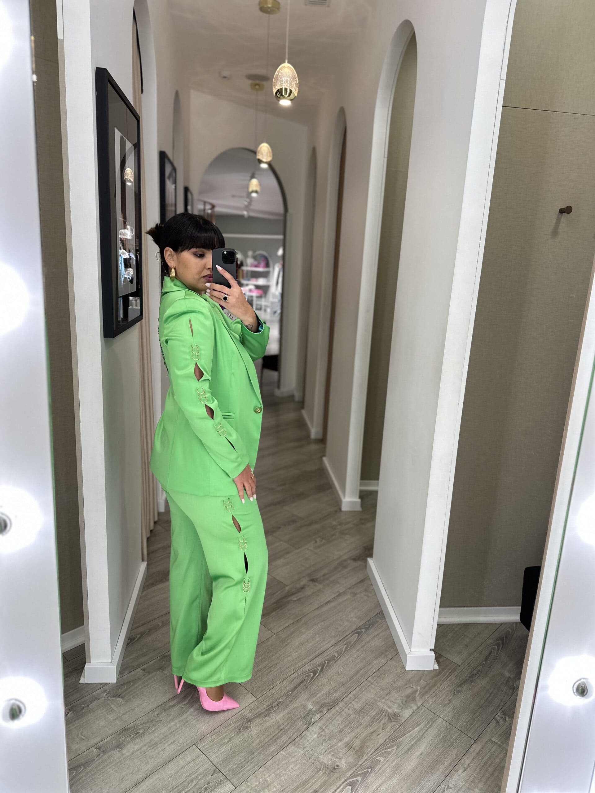 Uma peça que une elegância e ousadia na medida certa. Em tom verde vibrante com acabamento acetinado, esta calça destaca-se pela sua fluidez e brilho subtil, criando um efeito sofisticado e moderno.