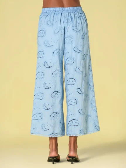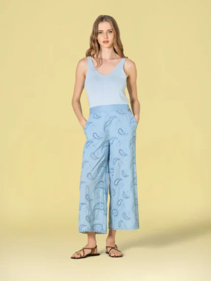 CALÇA CULOTE AZUL COM BORDADO INGLÊS RUGA