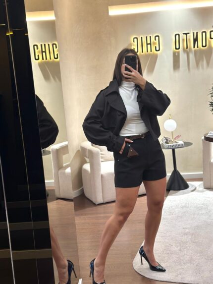 Os calções pretos da marca Renascimento destacam-se pelo tecido texturizado em relevo, que acrescenta um toque de sofisticação e originalidade à silhueta. Confeccionados em 98% poliéster e 2% elastano, garantem conforto e estrutura, mantendo um caimento elegante e moderno.