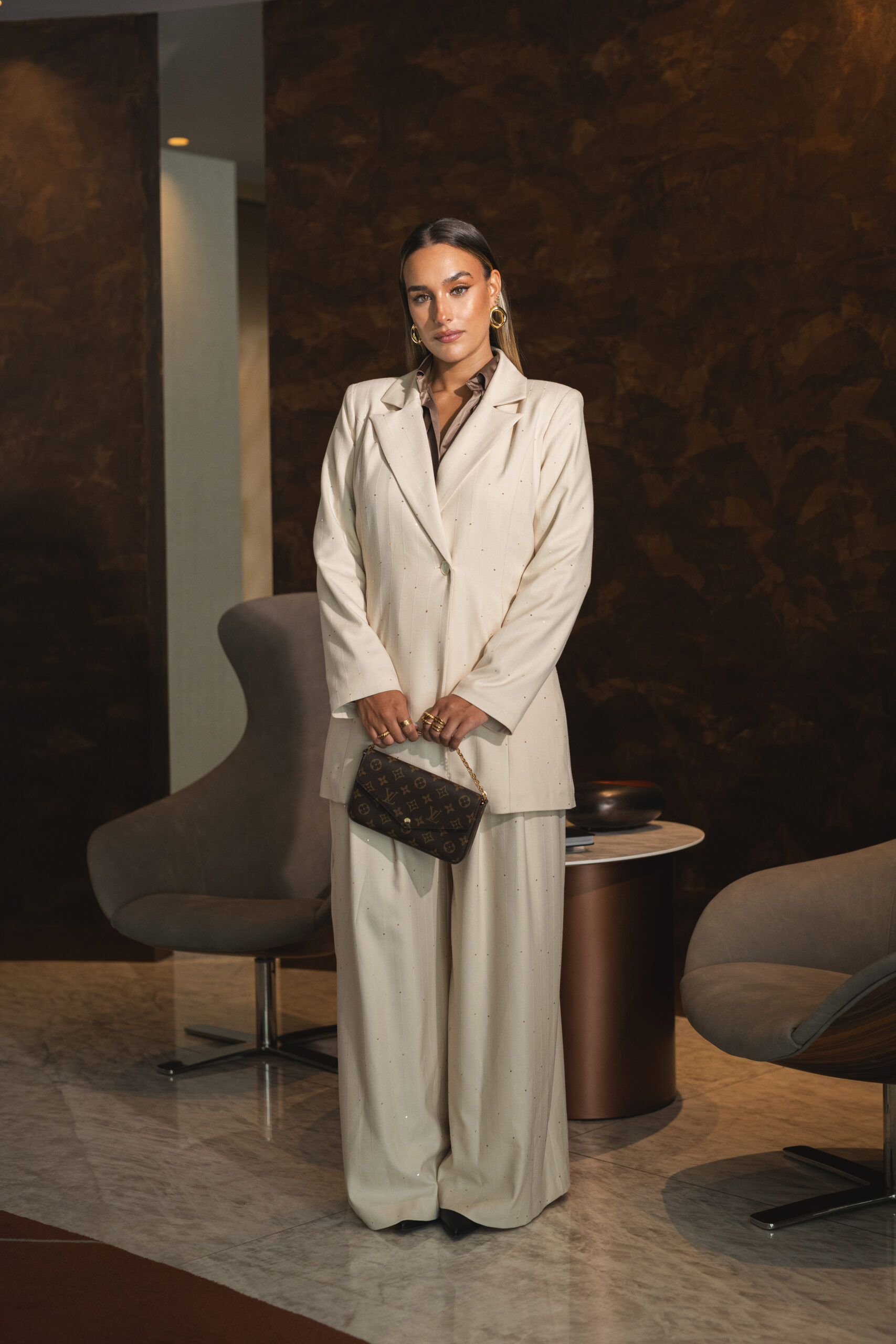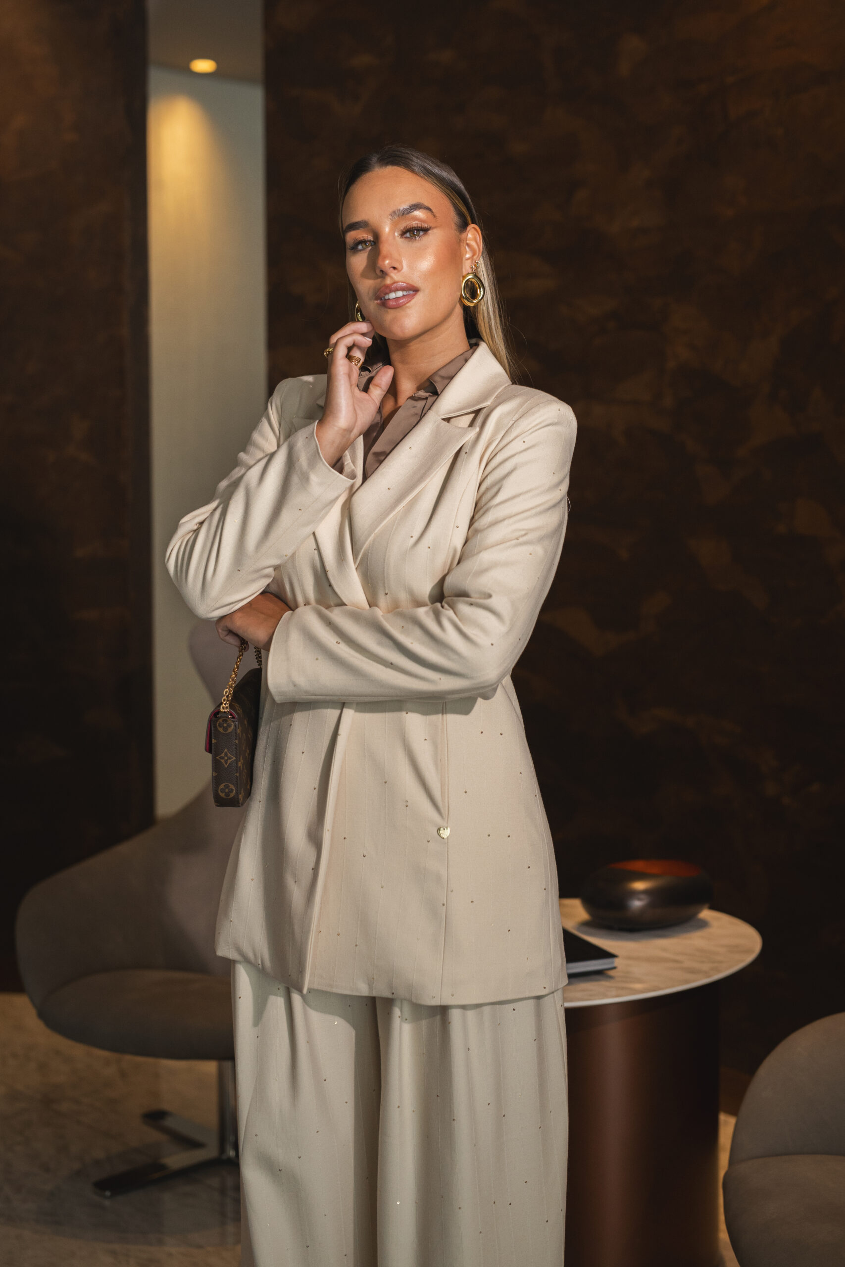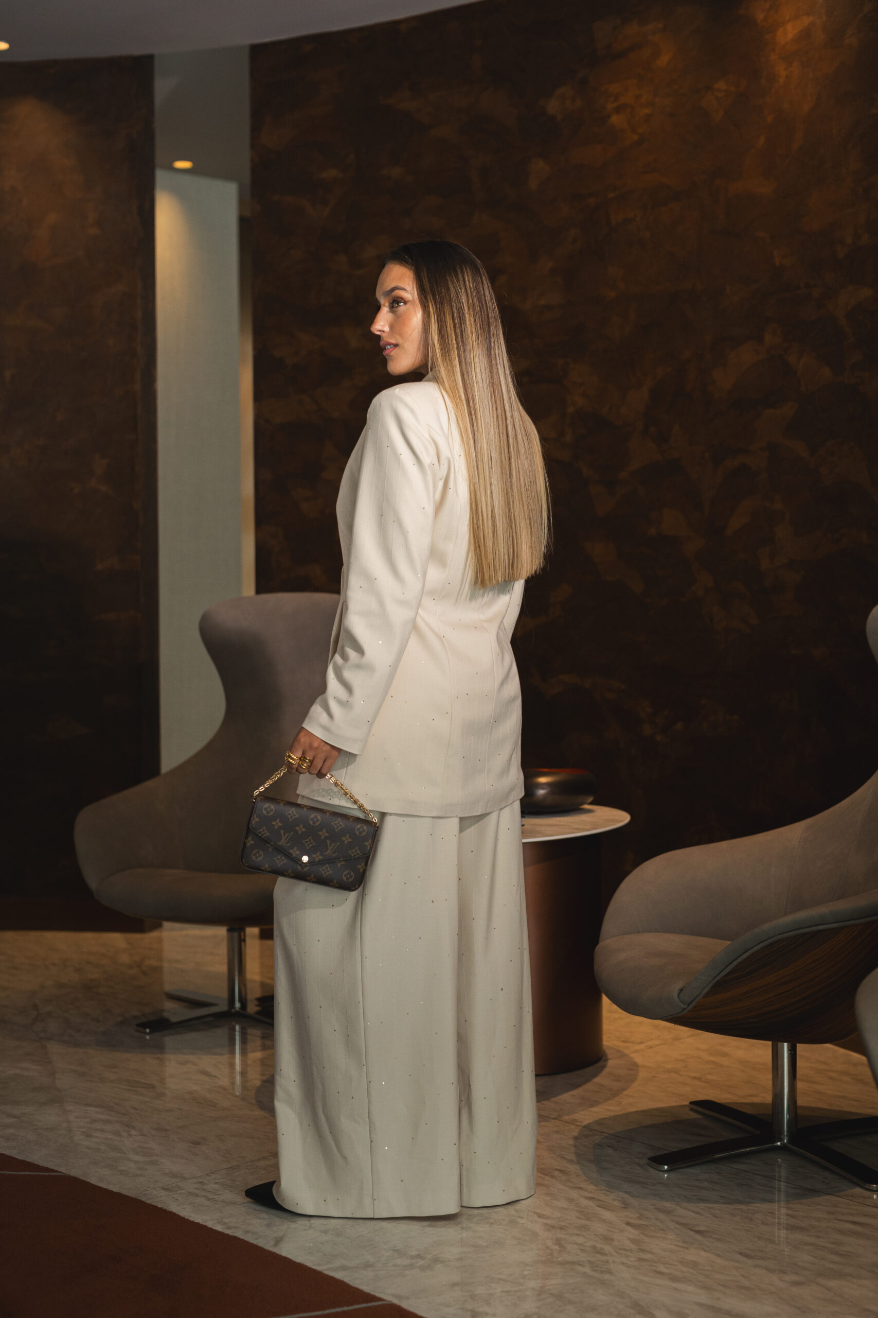O modelo apresenta pregas frontais e fecho com botão forrado, conferindo um visual elegante e moderno. As pequenas aplicações brilhantes distribuídas ao longo do tecido acrescentam um detalhe delicado e feminino, perfeito para elevar o teu look com subtilidade.