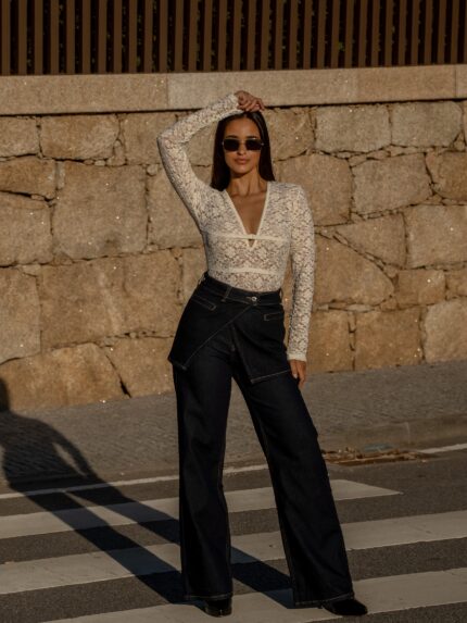 O design distingue-se pelo corte moderno e pelos bolsos falsos na frente, que acrescentam um toque de sofisticação. O detalhe metálico dourado lateral reforça o caráter elegante da peça e torna o modelo ainda mais exclusivo.