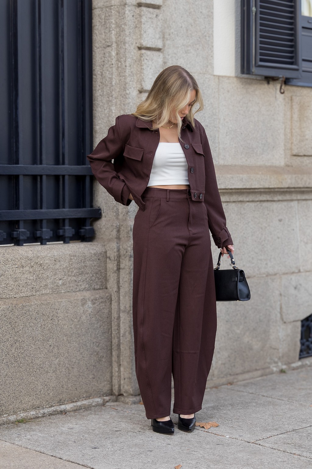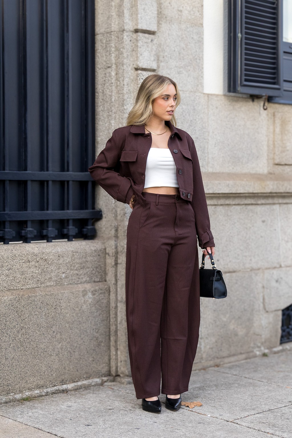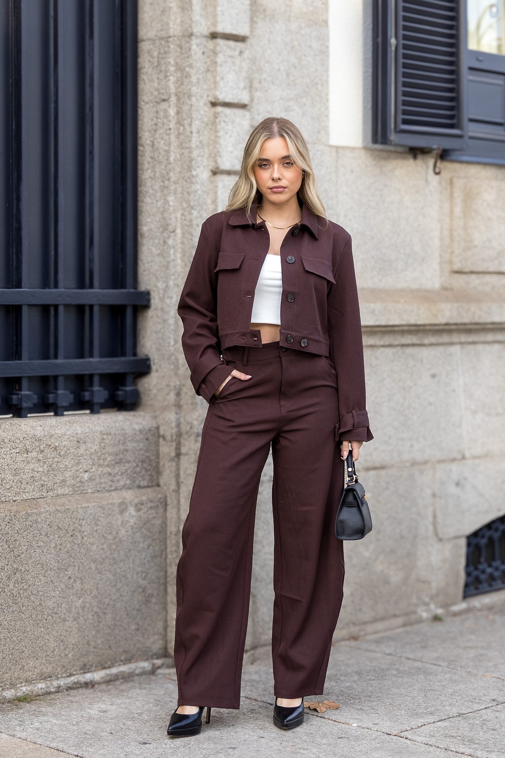Com corte reto e cintura média, estas calças têm bolsos laterais funcionais e fecho frontal com botão, num design clean e sofisticado que valoriza a silhueta. O acabamento polido e o tom castanho profundo tornam-nas uma peça essencial e versátil.