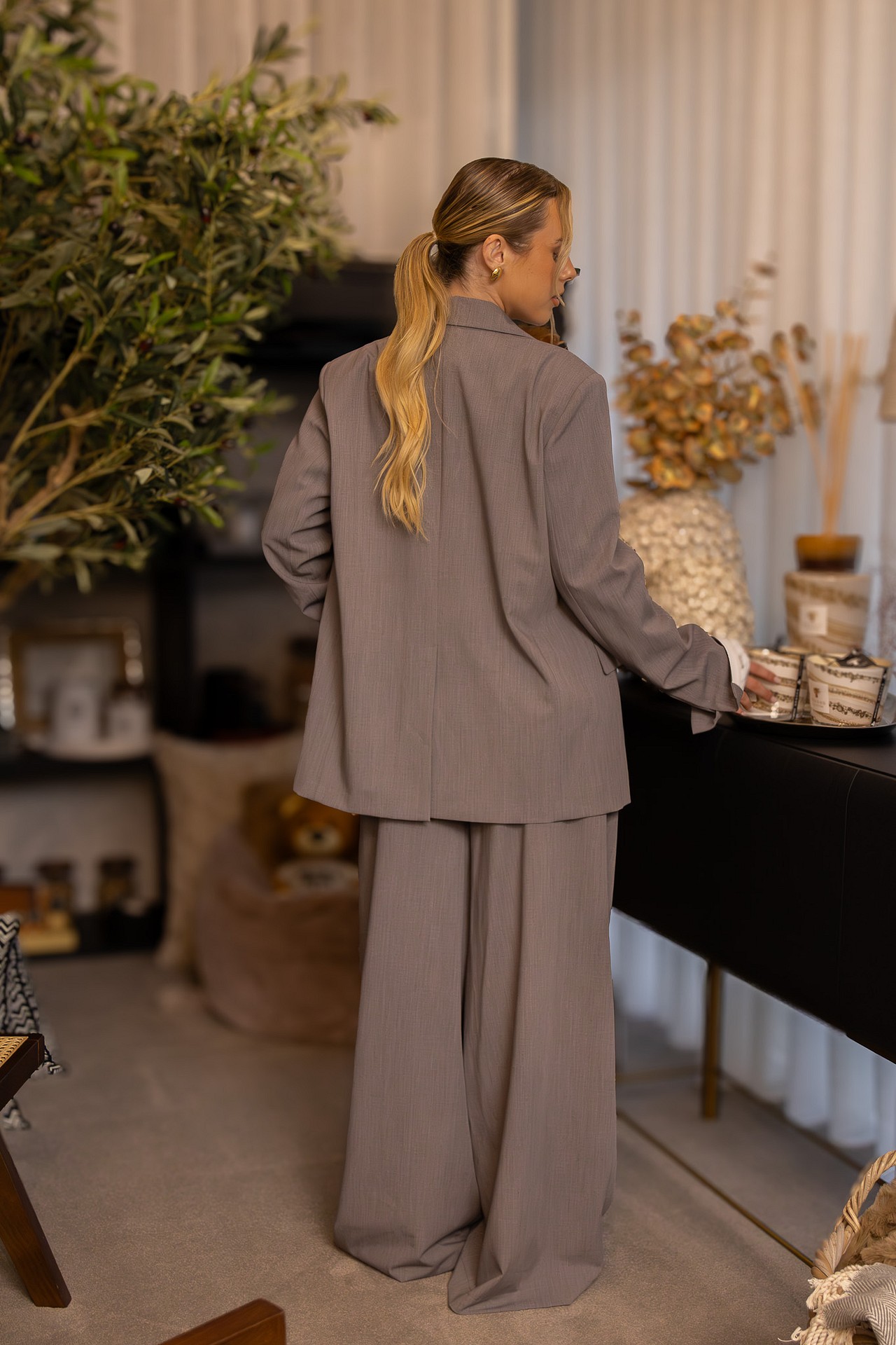 Com pregas frontais e um corte reto fluido, estas calças alongam a silhueta e adaptam-se facilmente a coordenados elegantes ou casuais. Uma peça versátil, sofisticada e essencial no guarda-roupa feminino moderno.