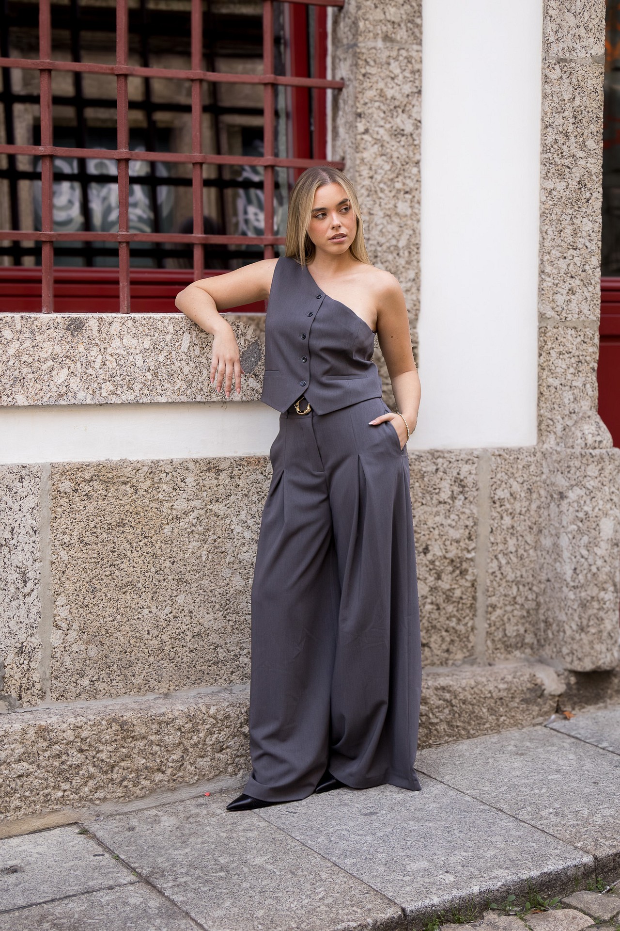 Versáteis e intemporais, as calças cinzentas de corte largo Imperial são perfeitas para coordenados de trabalho ou eventos formais. Combina-as com camisas de seda, blazers ou tops estruturados e cria um look sofisticado, feminino e seguro de si.