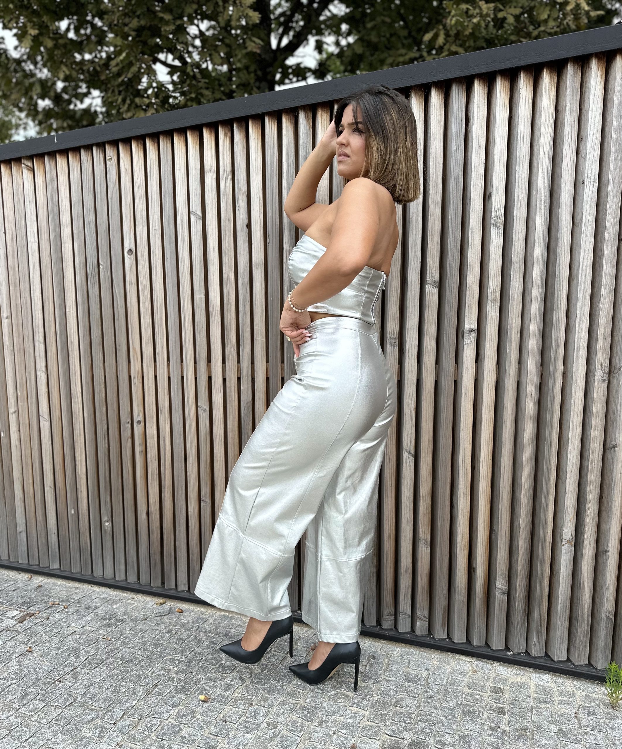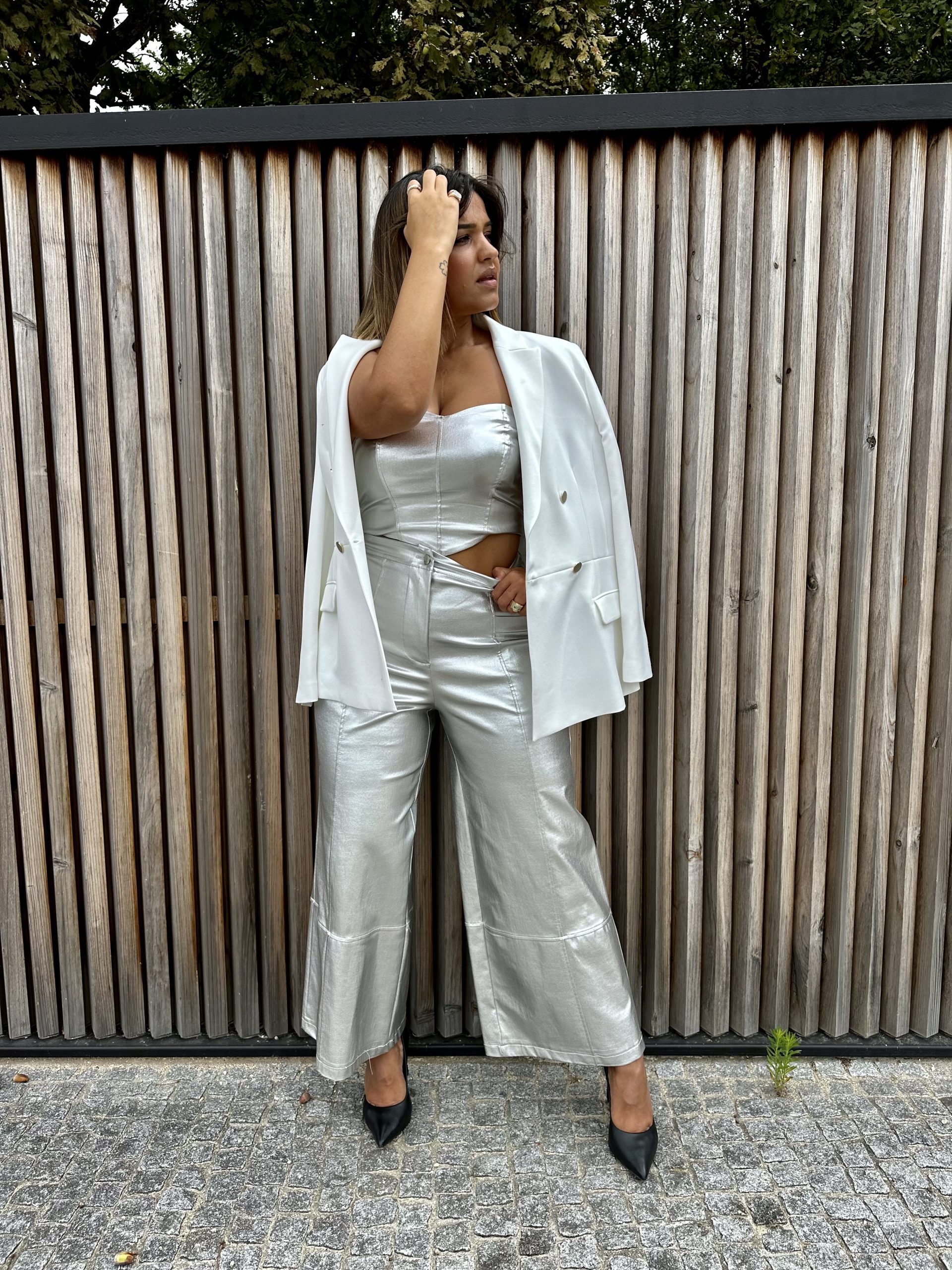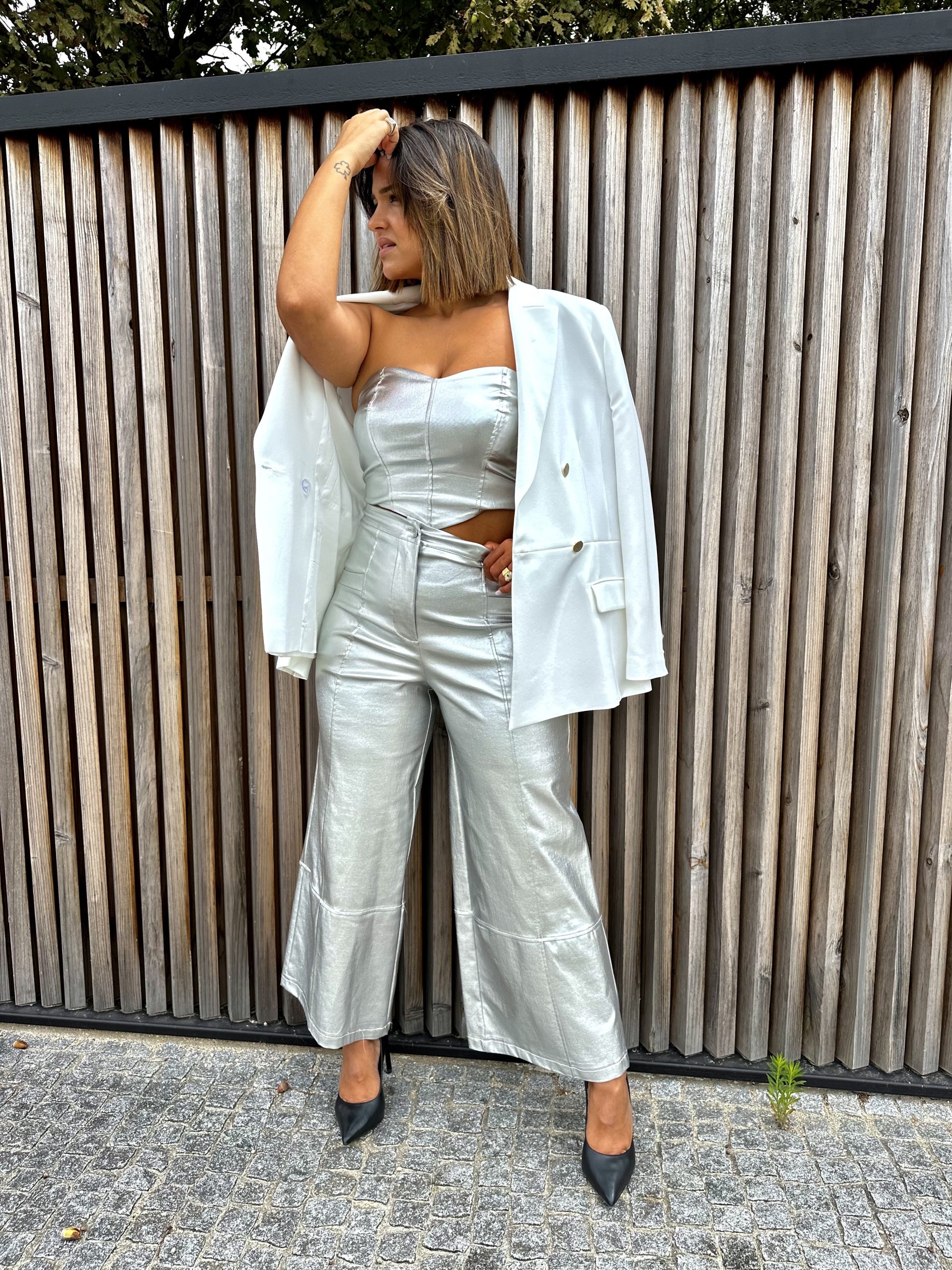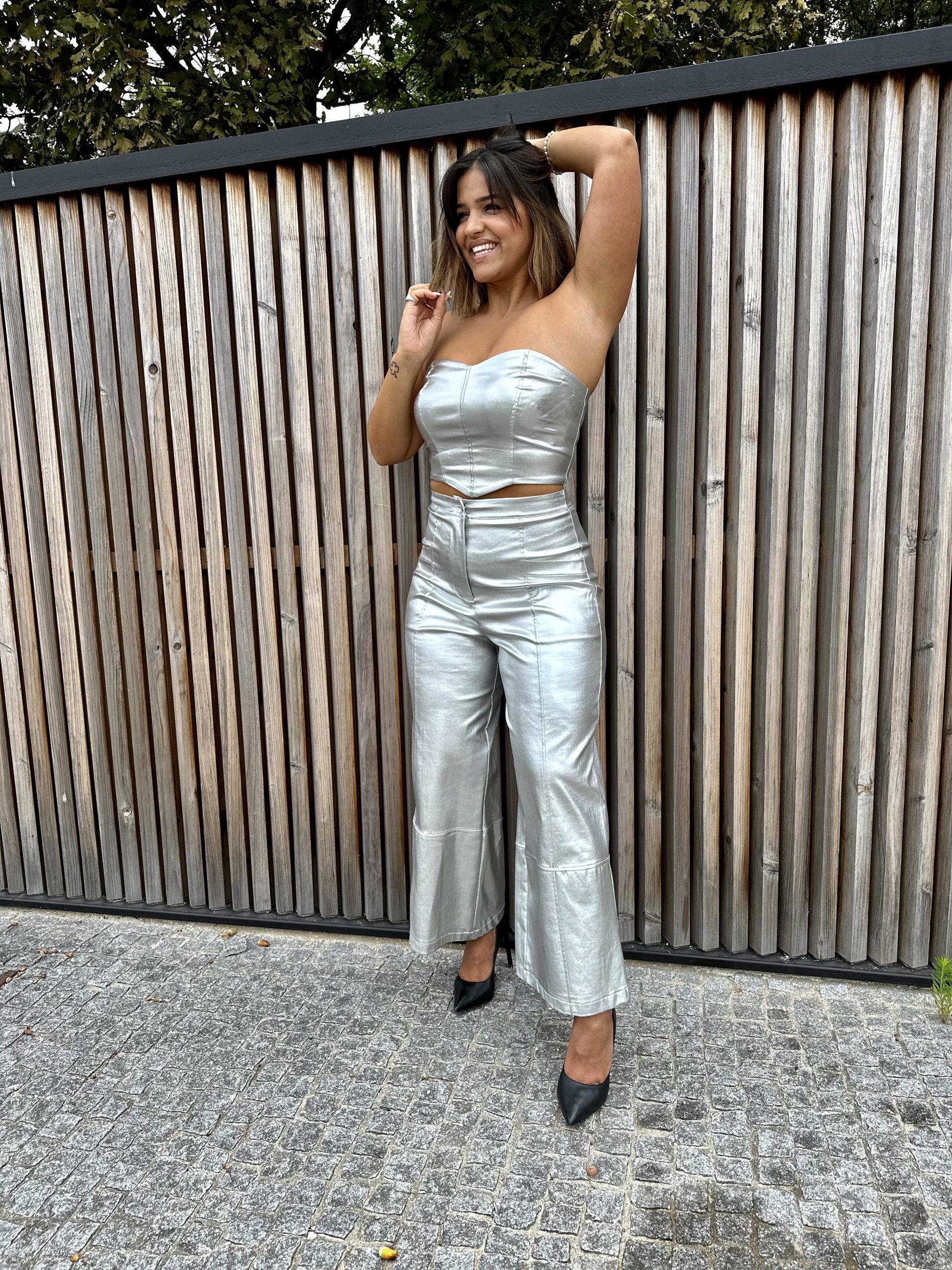 Com um visual requintado e atual, as calças cinzento metalizado Rinascimento tornam-se ainda mais impactantes quando combinadas com o top metalizado a condizer, formando um conjunto harmonioso e cheio de personalidade.