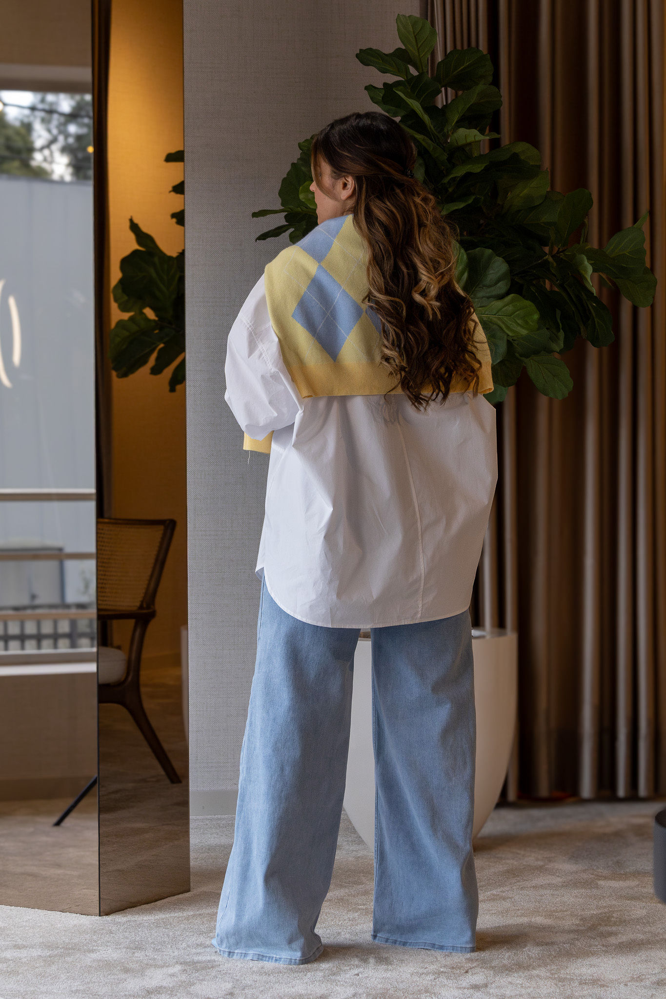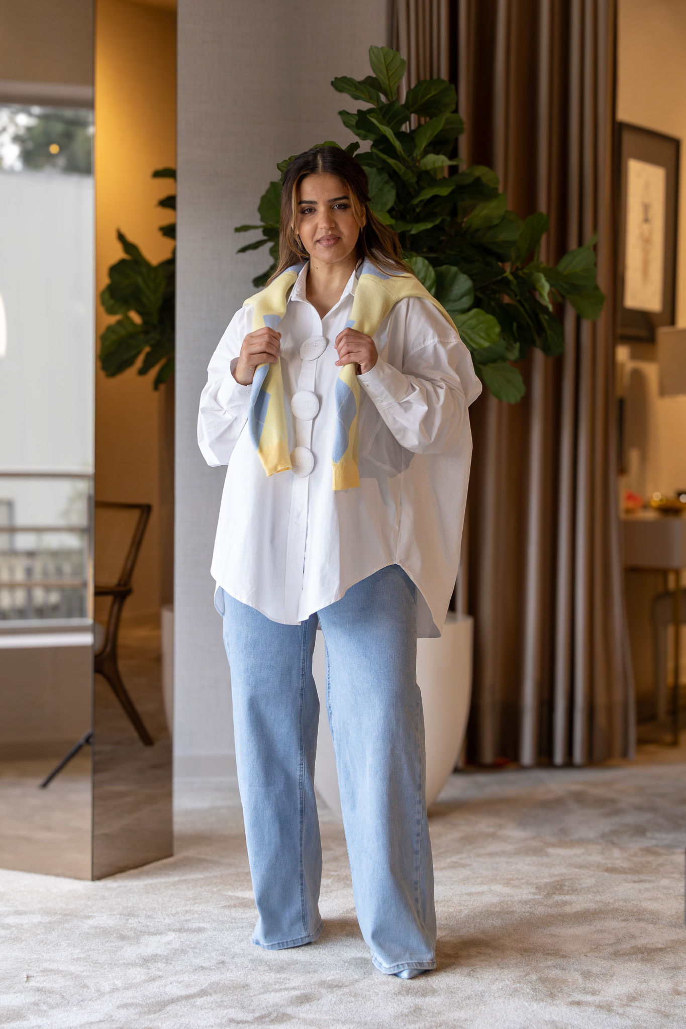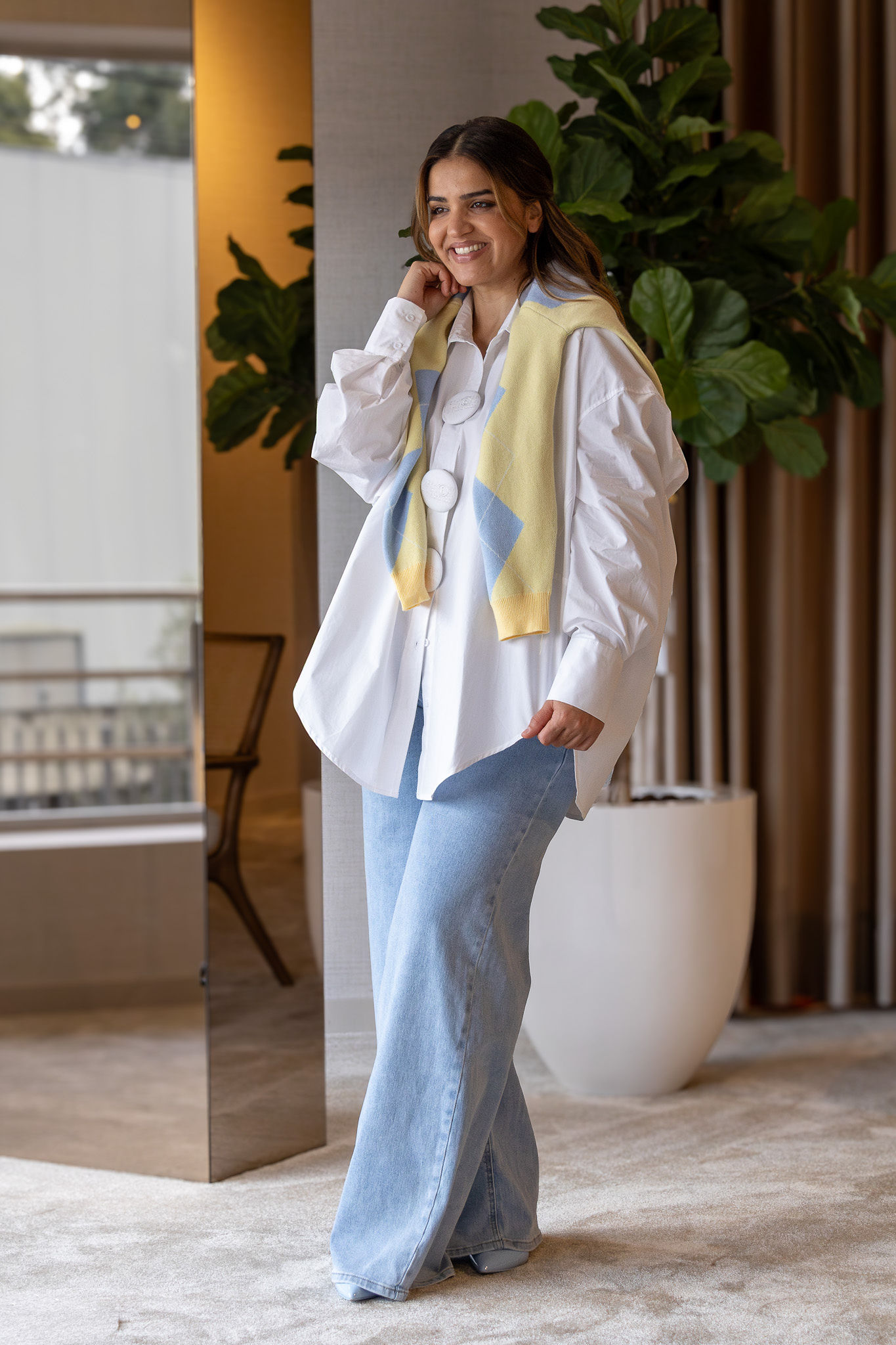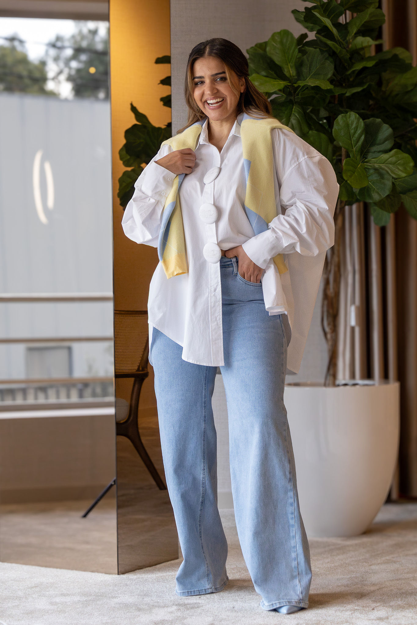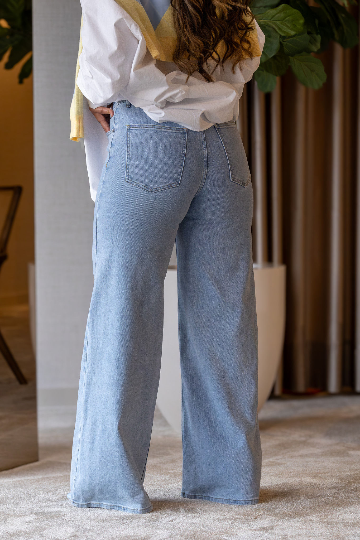 Estas calças de ganga em tom azul claro apresentam um design moderno e intemporal, ideal para integrar looks descontraídos mas sempre cuidados. O corte wide leg confere um visual atual e elegante, alongando a silhueta e garantindo conforto ao longo de todo o dia.