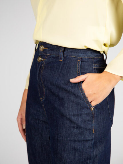 O design destaca-se pelo corte wide leg com detalhe de saia sobreposta na parte frontal e traseira, criando um efeito arrojado e moderno. As costuras em contraste e os bolsos clássicos reforçam o aspeto autêntico da ganga premium.