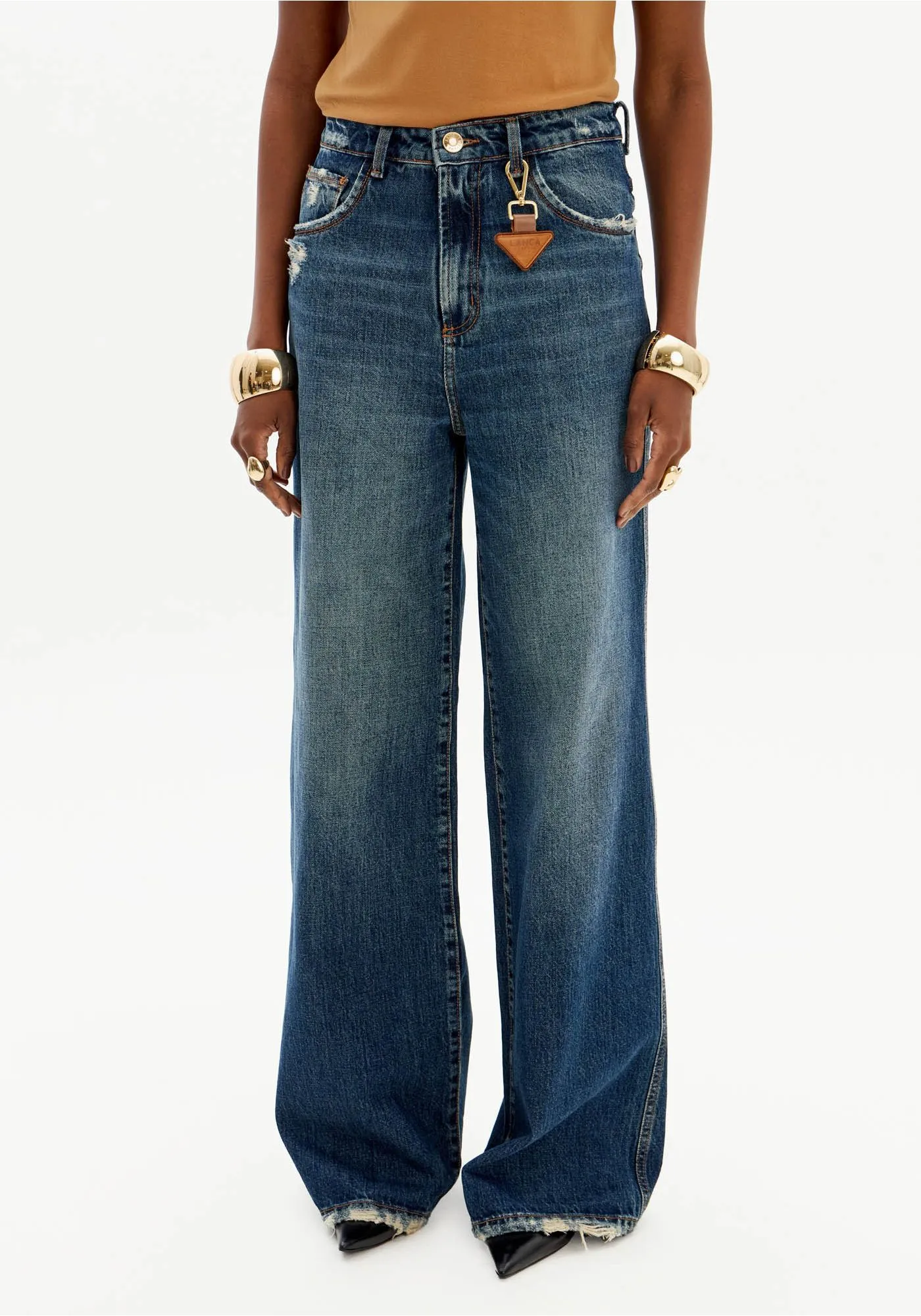 CALÇAS DE GANGA AZUL MÉDIO WIDE LEG COM LAVAGEM DESGASTADA LANÇA PERFUME