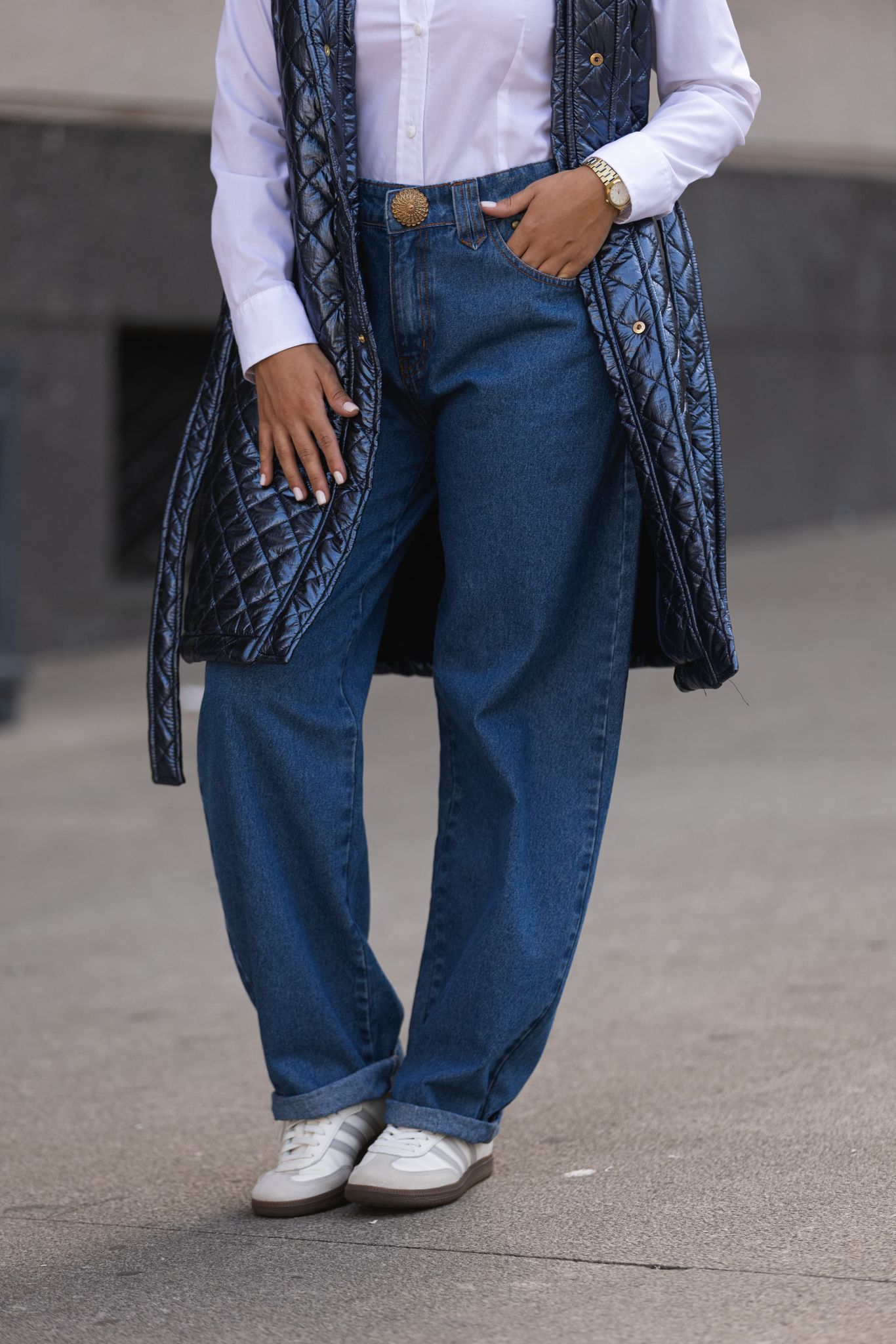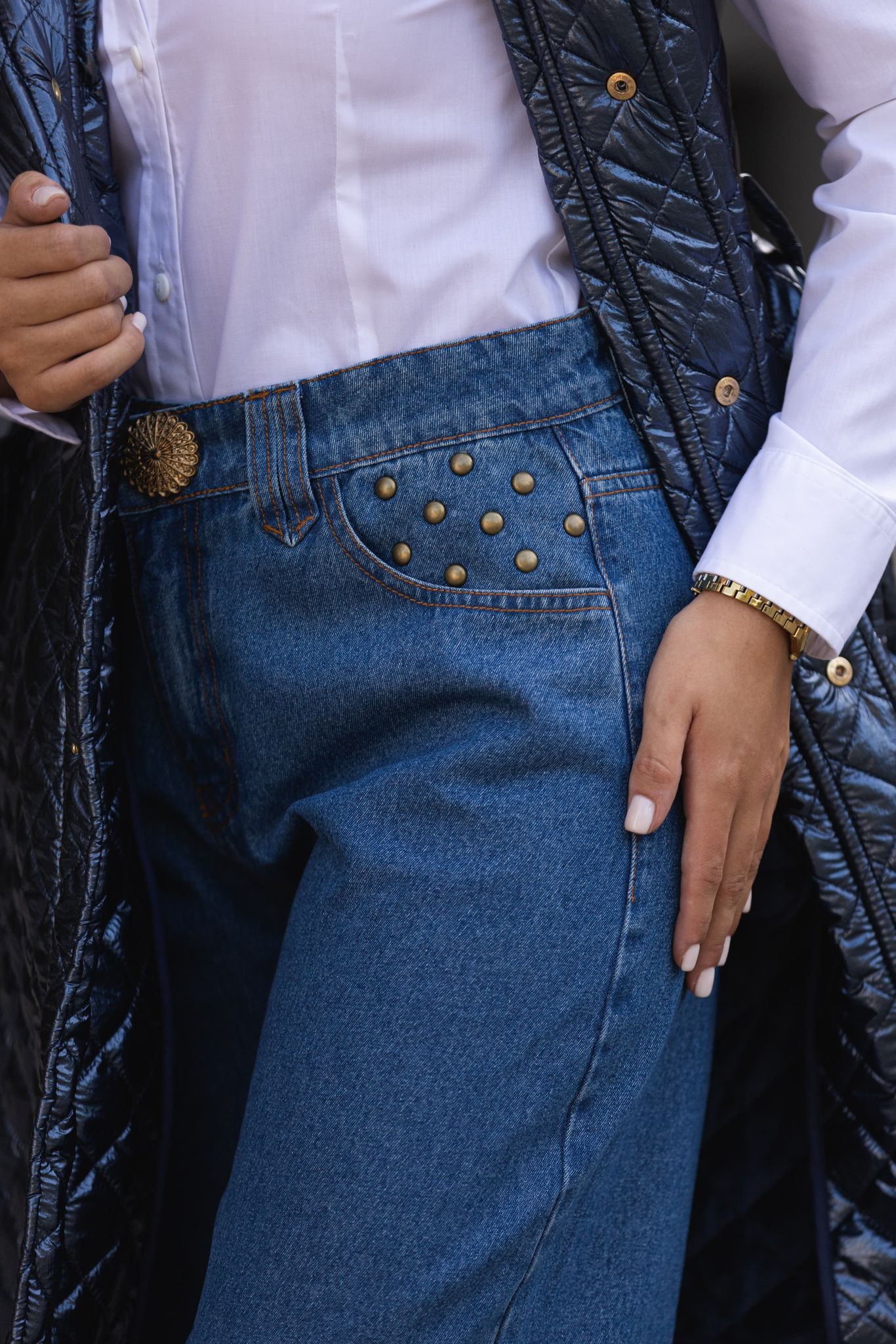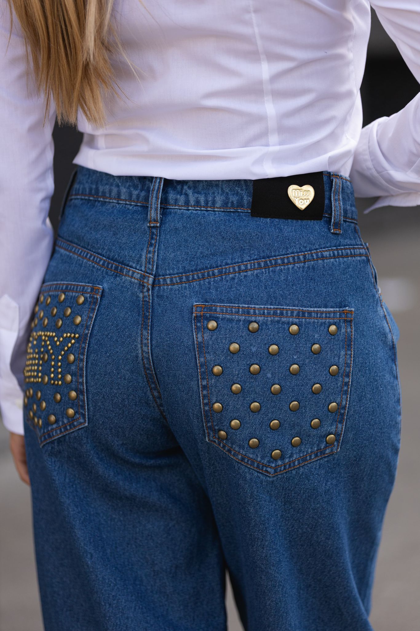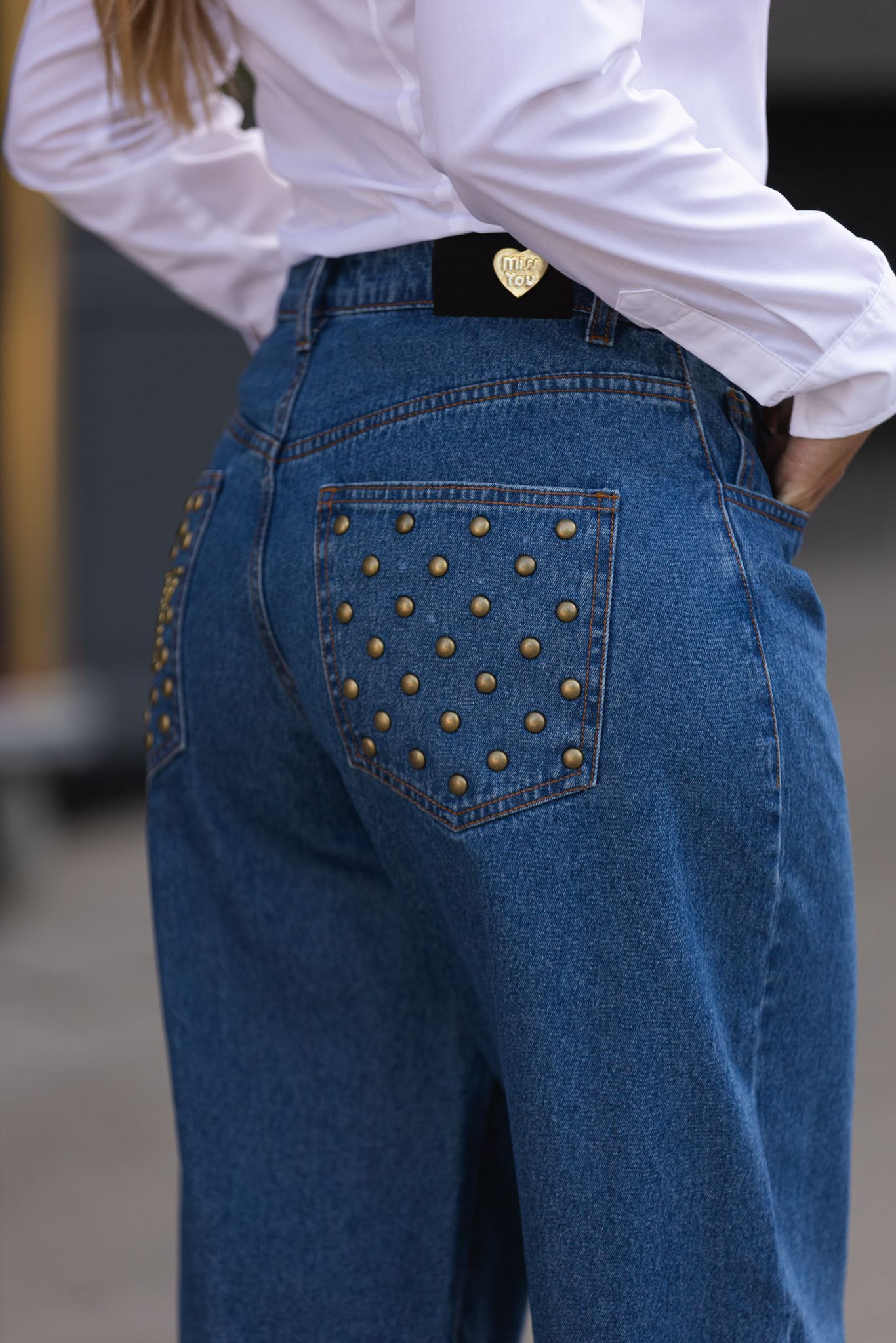 As calças de ganga balloon da marca Miss You destacam-se pelo corte descontraído e contemporâneo, ideal para looks casuais cheios de personalidade. Na parte da frente, os rebordos são realçados por pequenos tachas metálicas, enquanto os bolsos traseiros apresentam aplicações em padrão e o logótipo “MY” em studs dourados, conferindo um detalhe arrojado e moderno.