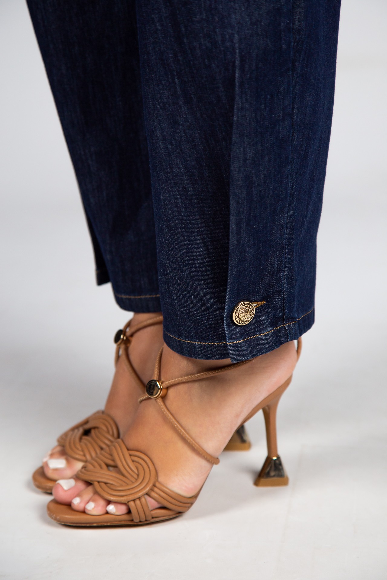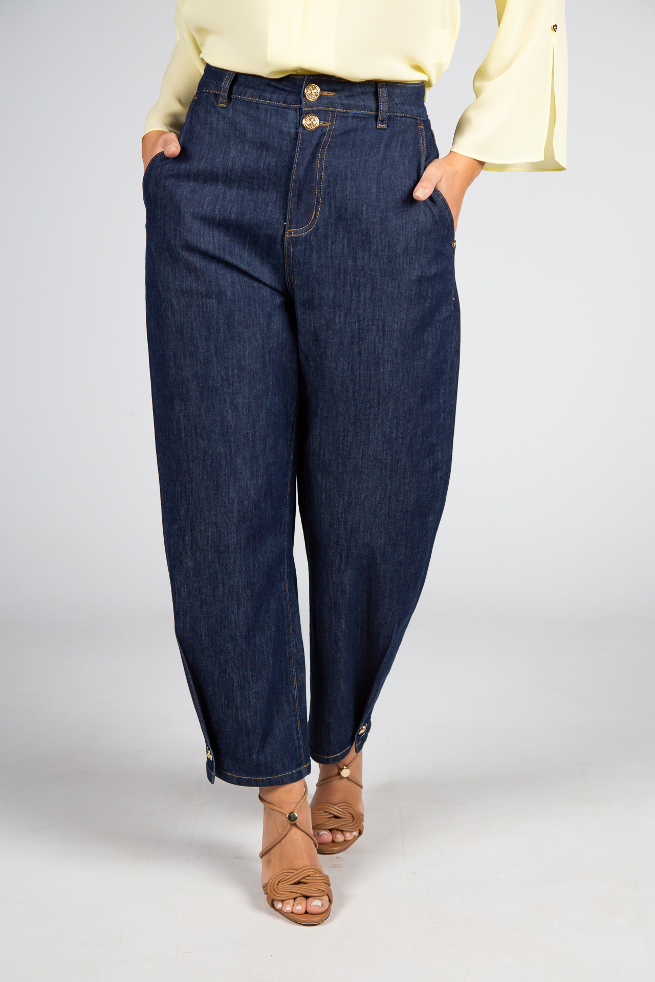 Apresentam um corte balloon fit, com volume na zona da anca e perna que afunila suavemente até ao tornozelo, criando uma silhueta moderna e diferenciadora. Destacam-se pelos detalhes cuidados, como os botões metálicos frontais, costuras contrastantes e acabamento com aba ajustável na bainha, que acrescenta personalidade à peça.