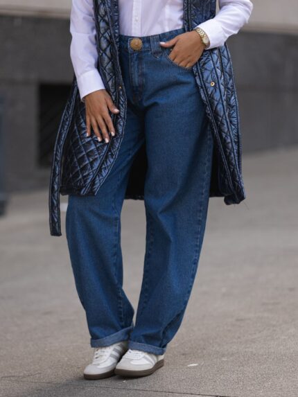O design wide leg confere um caimento fluído e alongado, realçando a silhueta com sofisticação. As costuras discretas e os bolsos clássicos completam o modelo, tornando-o atemporal e fácil de conjugar em diferentes estilos.