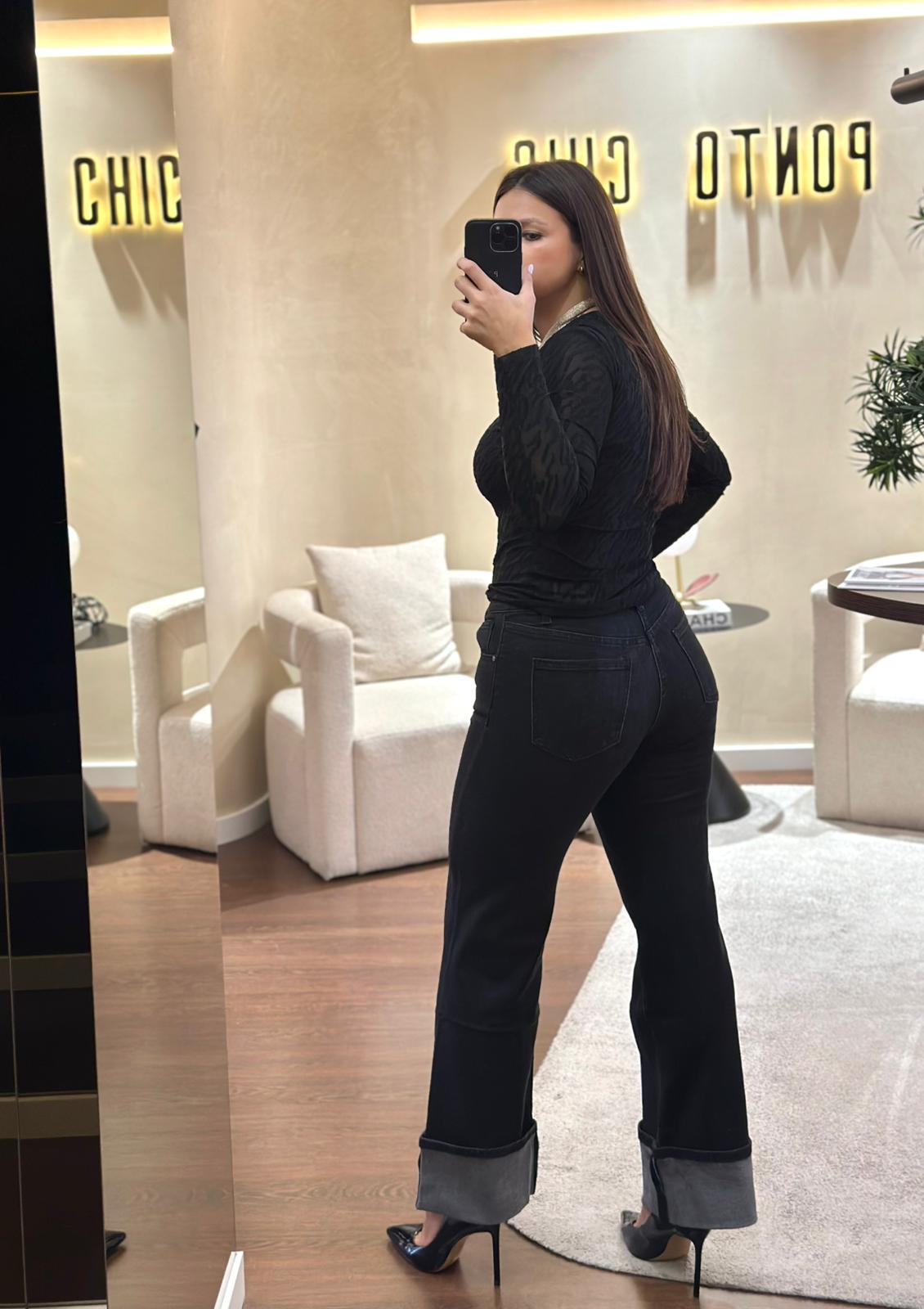 CALÇAS DE GANGA PRETA WIDE LEG PONTO CHIC
