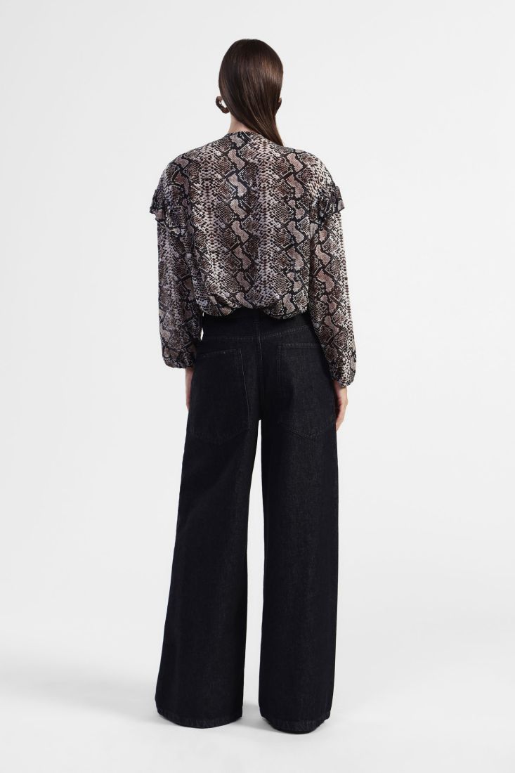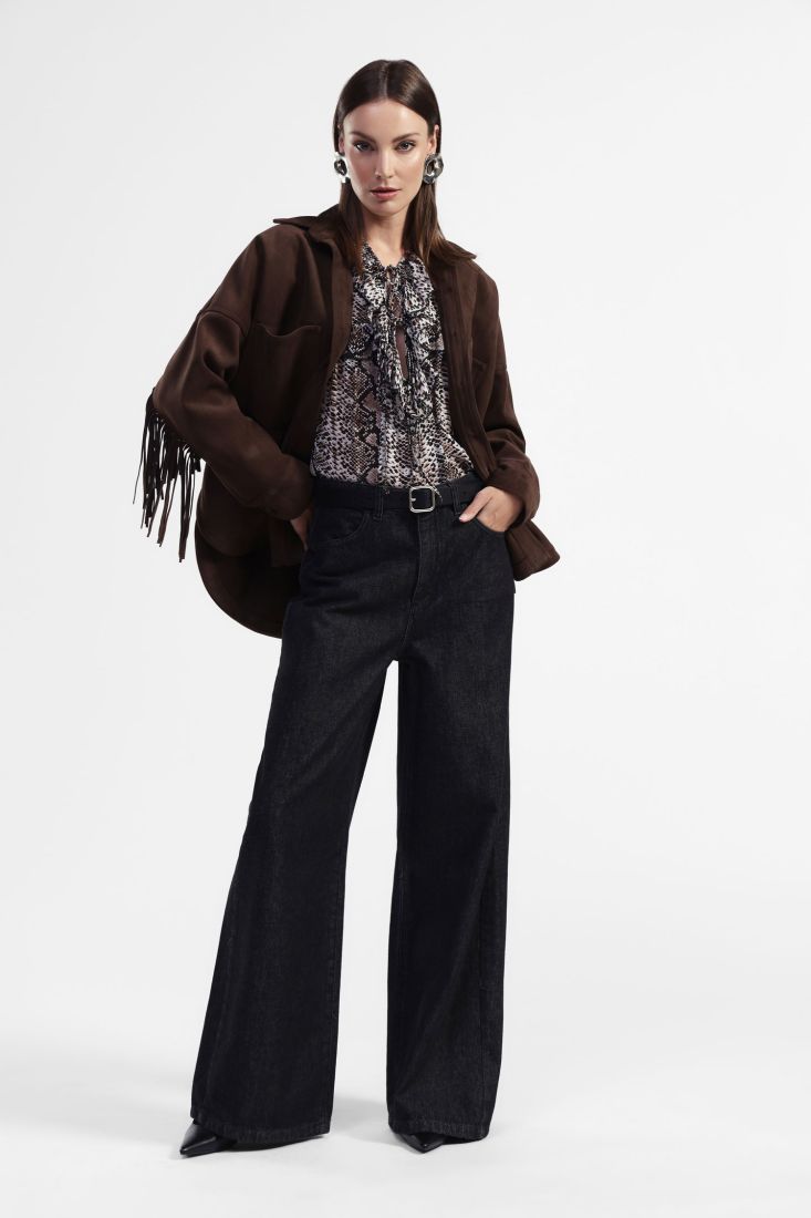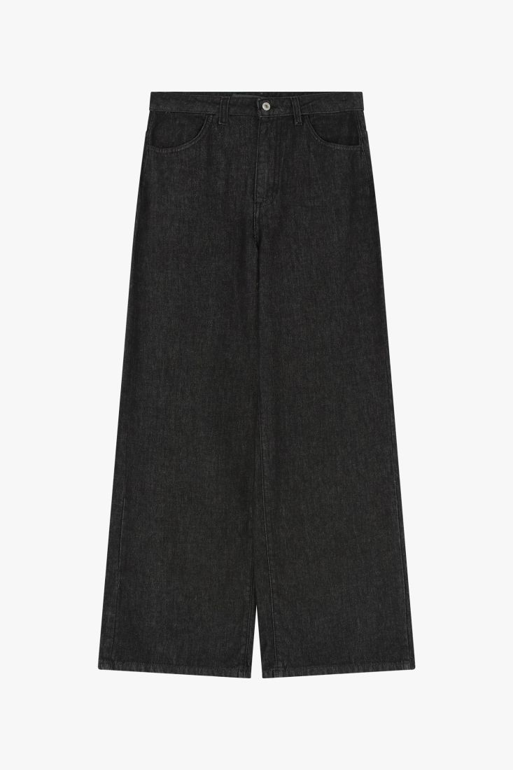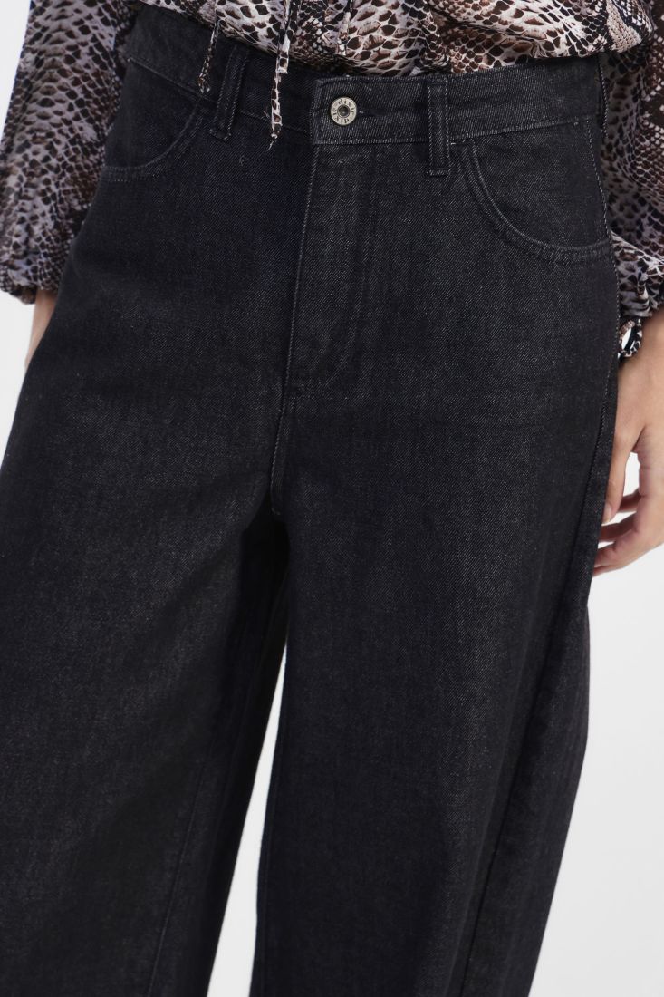 Com corte reto e cintura média, adaptam-se facilmente a diferentes silhuetas, proporcionando um visual elegante e descontraído. O acabamento preto lavado dá-lhe um ar urbano e contemporâneo — perfeito para coordenados de outono e inverno.