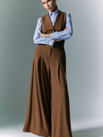 O design distingue-se pelas pregas frontais estruturadas e pela silhueta ampla, que alonga a figura e cria um visual sofisticado. O detalhe metálico discreto na cintura reforça a identidade refinada da marca.