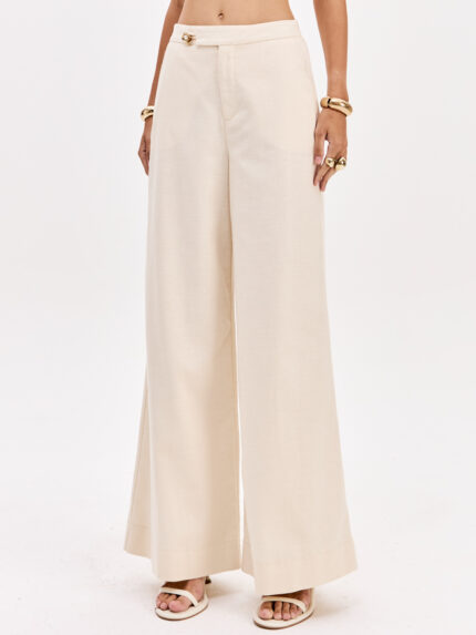 As calças pantalona da marca Miss You combinam elegância e modernidade com o seu tecido canelado em tom bege e o detalhe sofisticado em efeito pele na cintura.