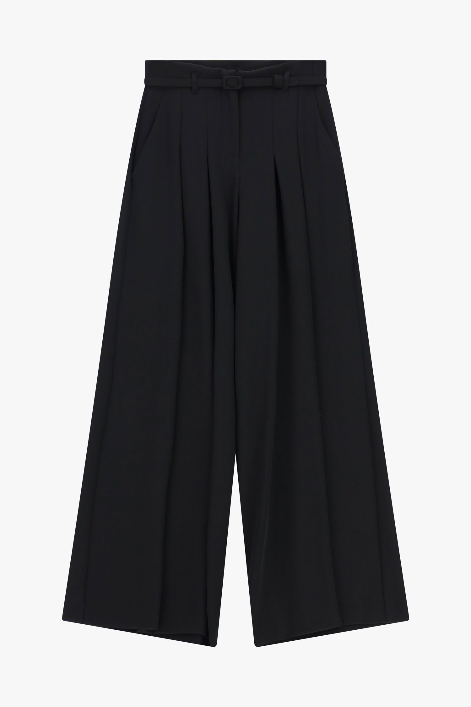 O design apresenta pregas profundas na parte frontal e um cinto ton sur ton com fivela forrada, que acentua a cintura e adiciona sofisticação ao modelo. O corte largo e a fluidez do tecido criam movimento, resultando num visual moderno e sofisticado.