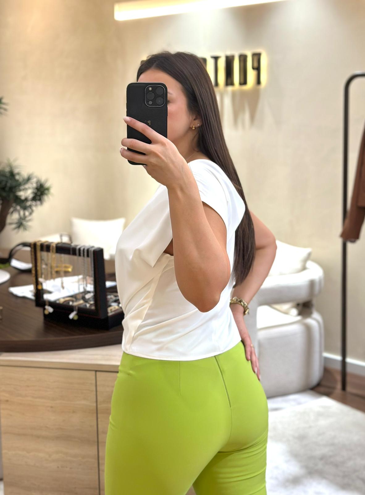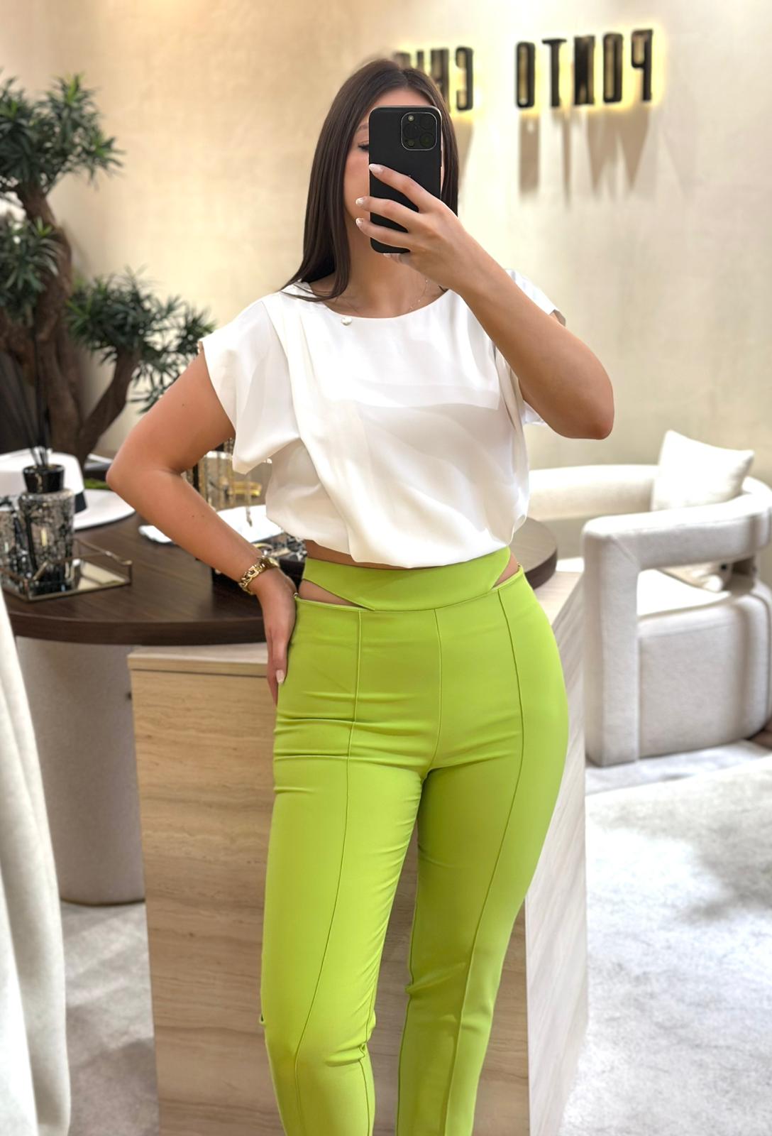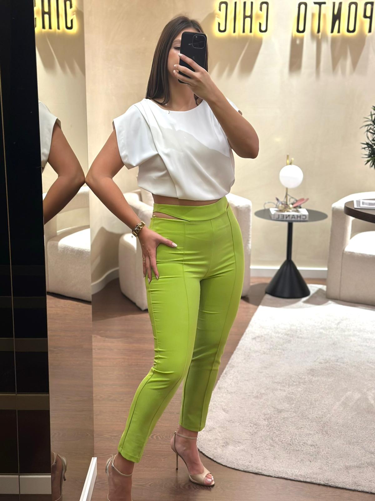 O grande destaque está no detalhe estruturado na parte superior — uma faixa dupla que forma um recorte geométrico, criando um efeito de cintura marcada e sofisticada. As pinças frontais acrescentam elegância ao corte, enquanto a cor verde lima ilumina o look com um toque moderno e cheio de atitude.