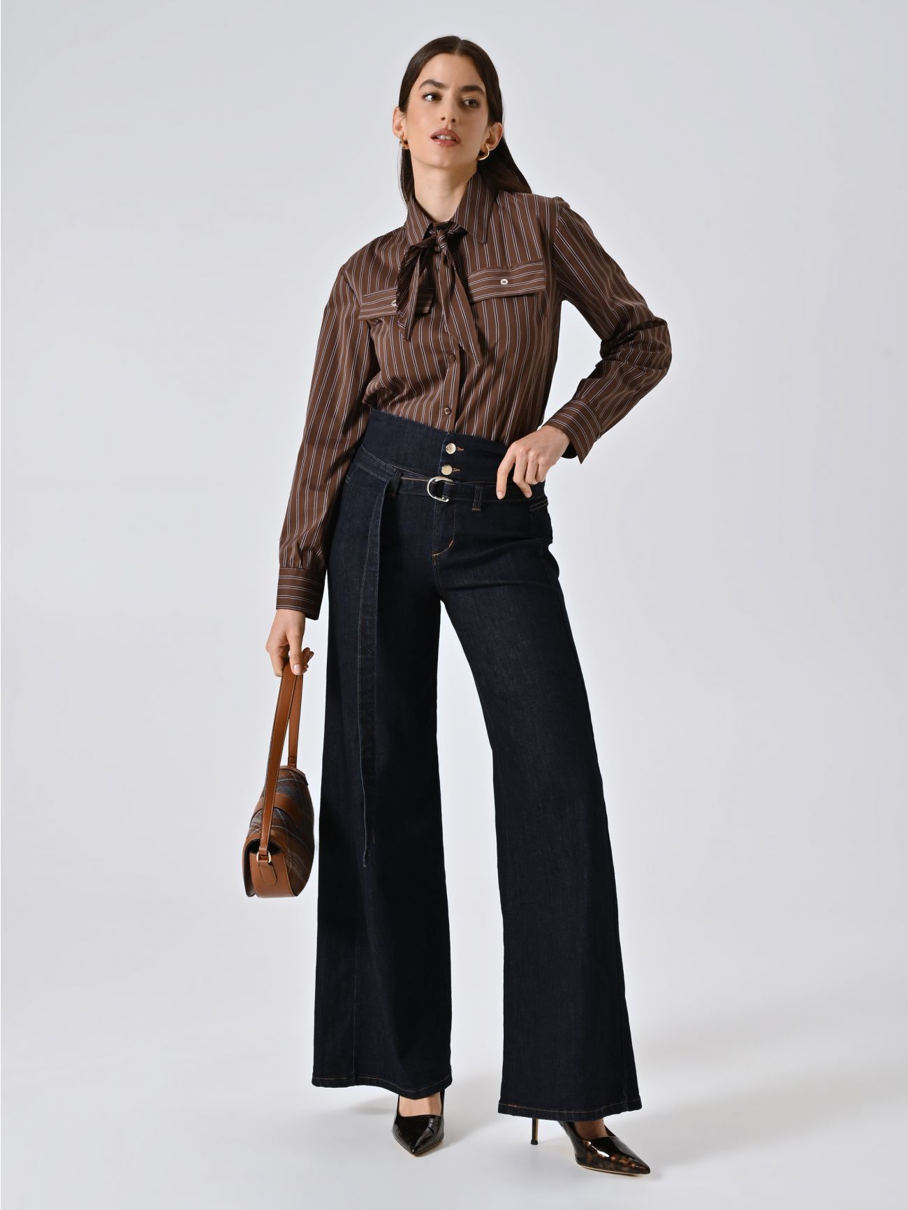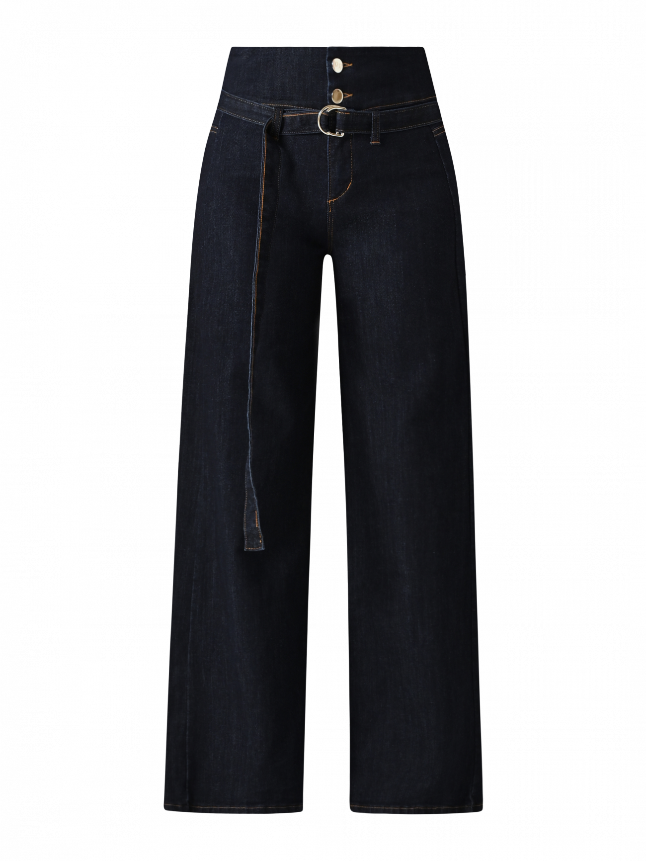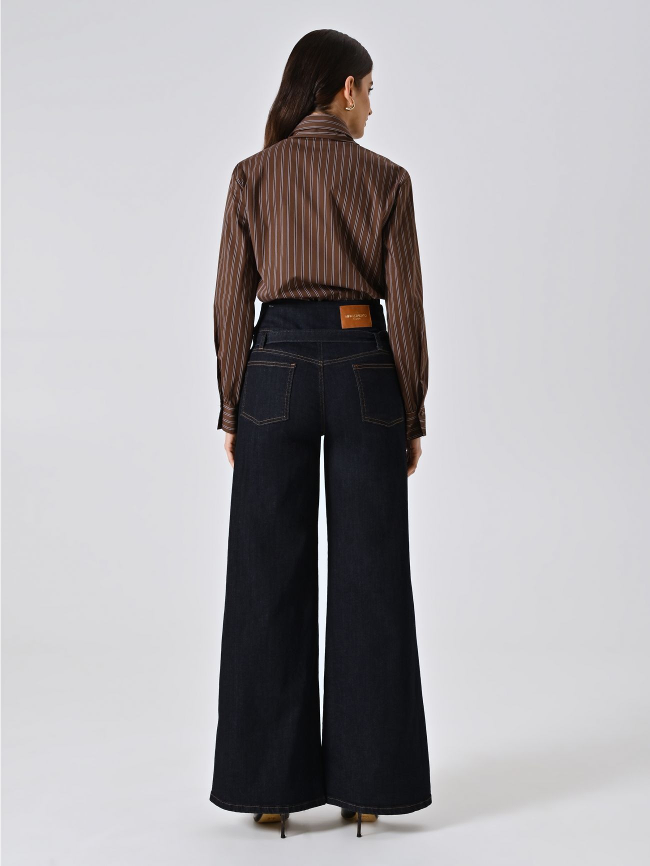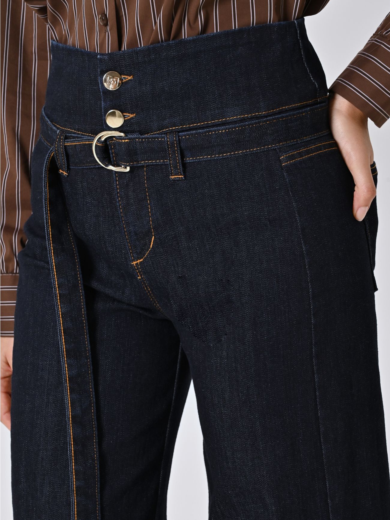 O tom azul-escuro do denim confere uma estética mais polida e versátil, perfeita para transitar entre looks casuais e coordenados mais arranjados. A cintura subida, reforçada por dupla carcela com botões metálicos, cria uma silhueta definida e atual. O cinto integrado, com presilha metálica circular, permite ajustar e valorizar a cintura, acrescentando um detalhe distintivo e contemporâneo. As costuras em contraste realçam o corte da peça e elevam o visual final.