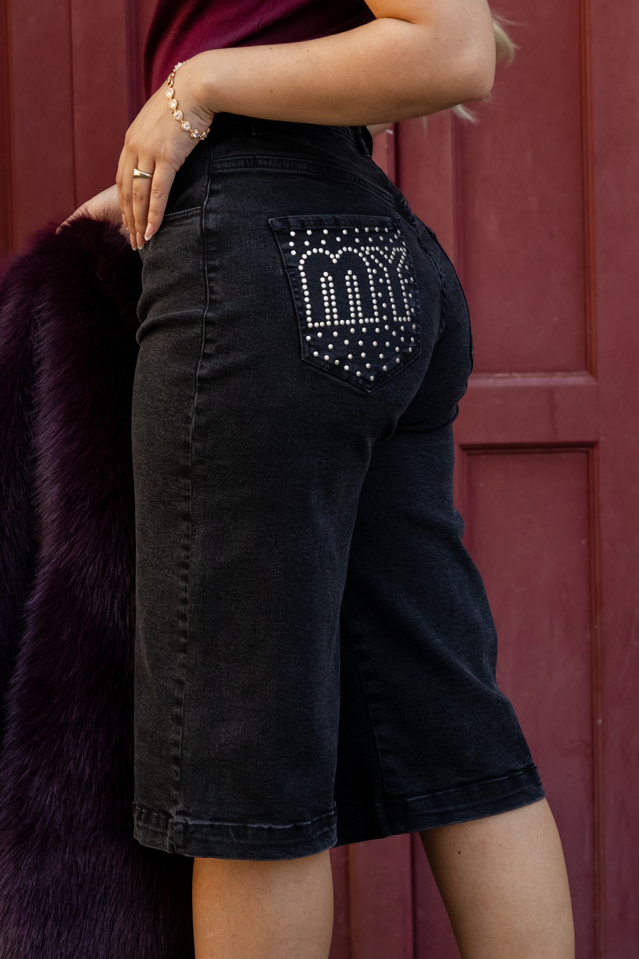 CALÇÕES DE GANGA PRETA COM APLICAÇÃO DE BRILHOS MISS YOU