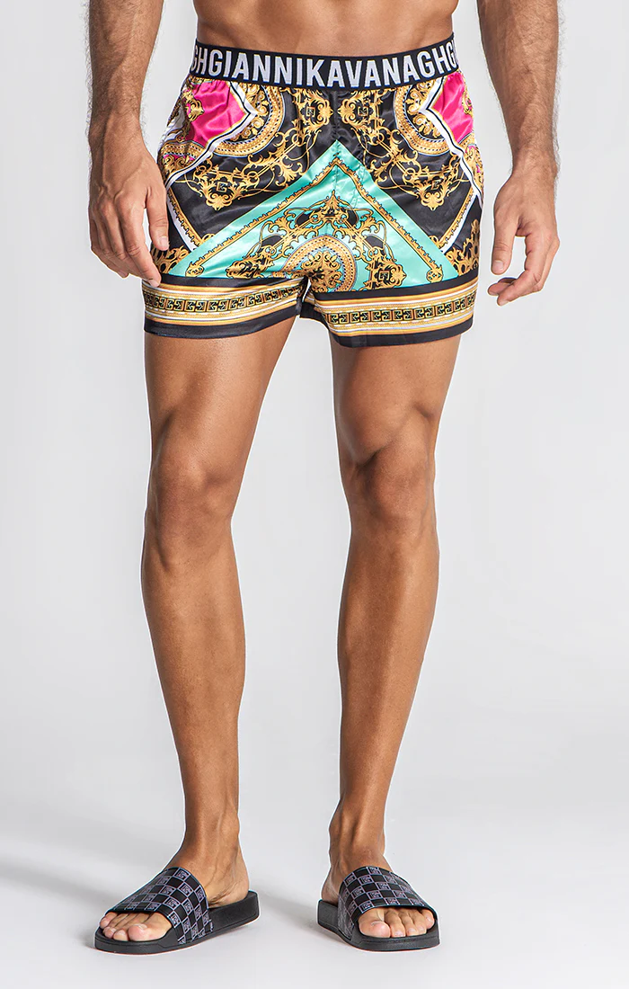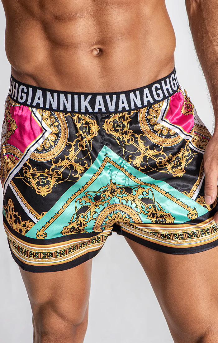 O design apresenta um padrão exclusivo de inspiração barroca, em tons vibrantes de preto, rosa e turquesa, complementado pelo elástico com logótipo GIANNI KAVANAGH na cintura.