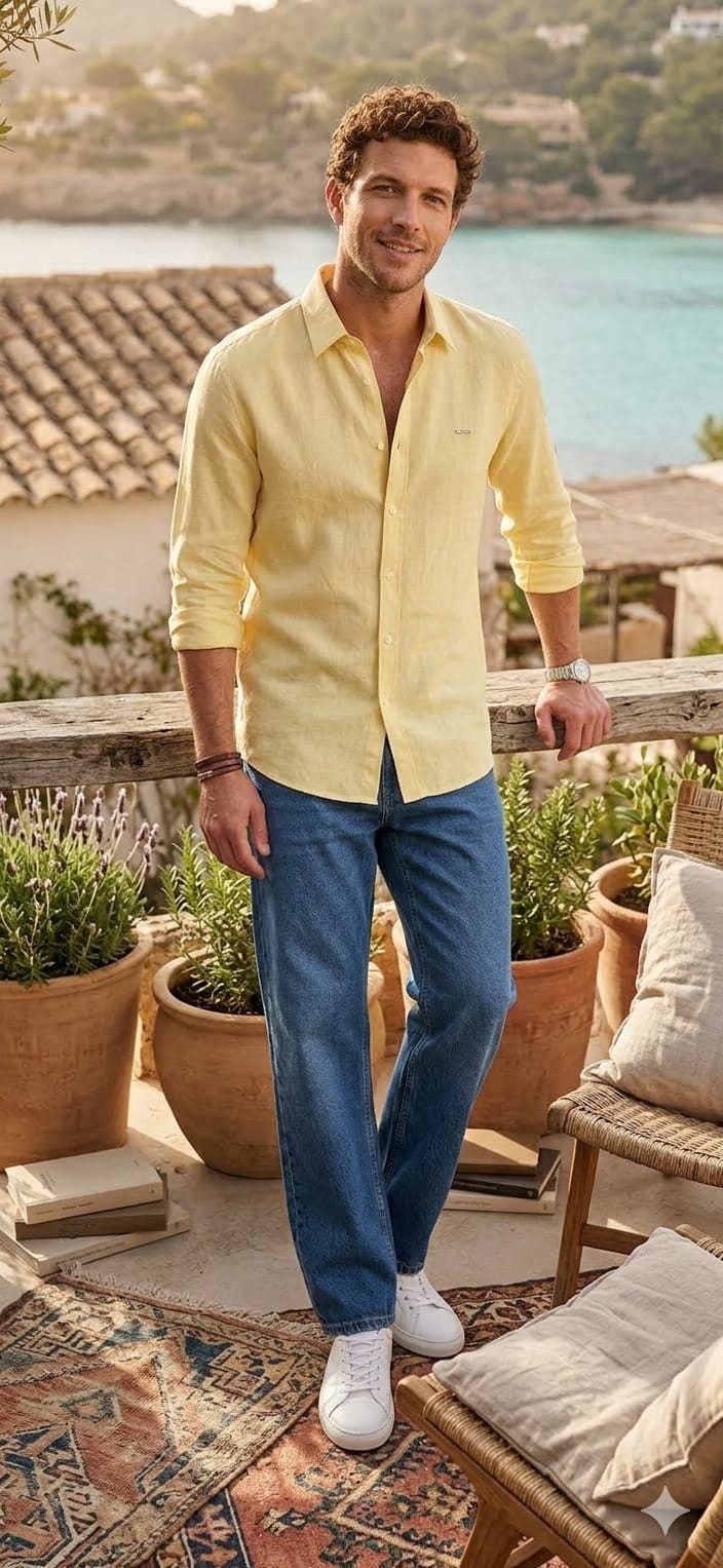 Camisa em tom amarelo, confecionada numa mistura de 70% algodão e 30% linho, que lhe confere leveza, respirabilidade e um toque naturalmente fresco ideal para os dias mais quentes.