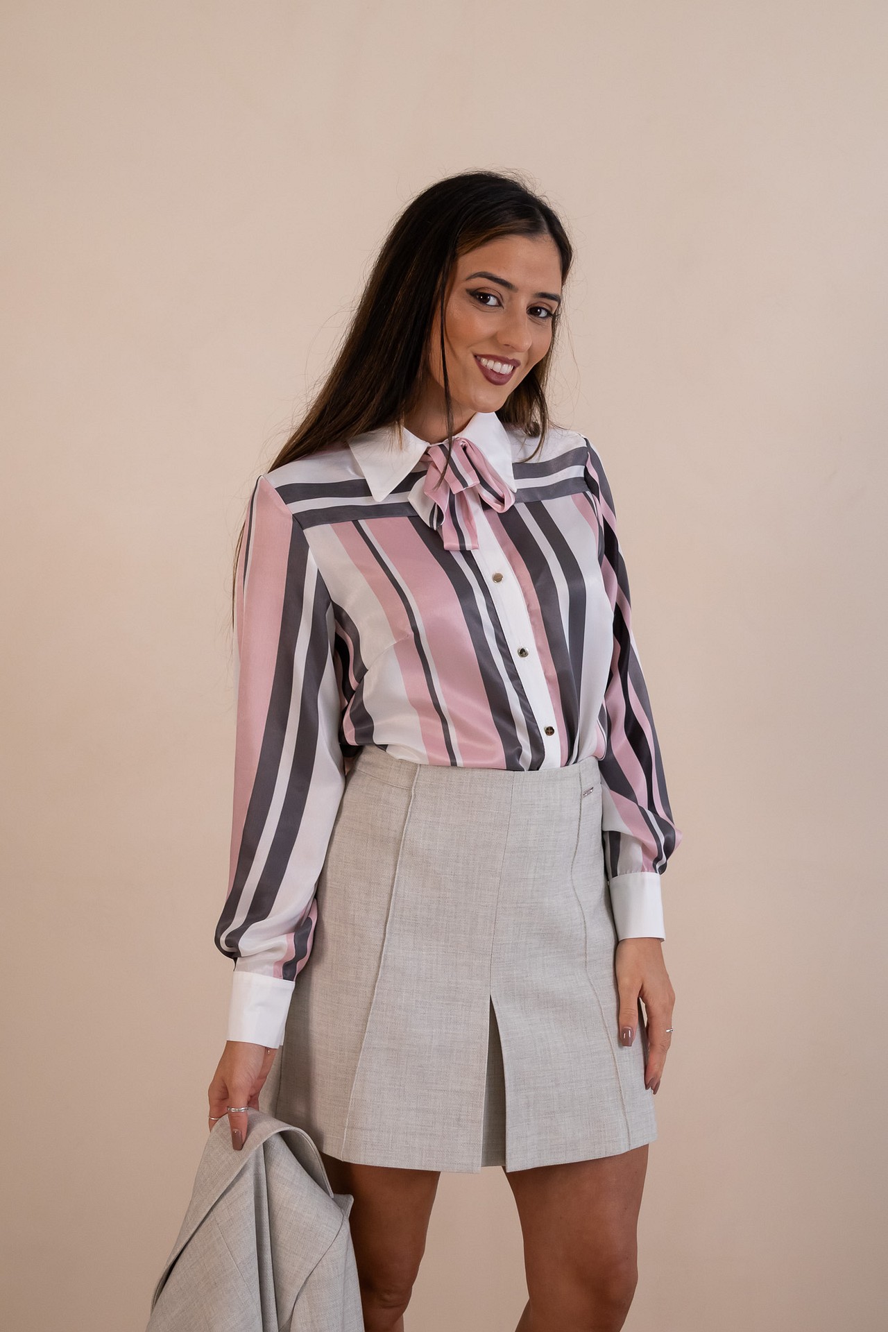 Com gola branca contrastante, punhos e laço no mesmo tom, o modelo distingue-se pelas riscas verticais em rosa, branco e preto, que criam um efeito visual sofisticado e alongador. Os botões metálicos subtis reforçam o caráter refinado da peça, enquanto o laço estreito na gola acrescenta um toque de charme.
