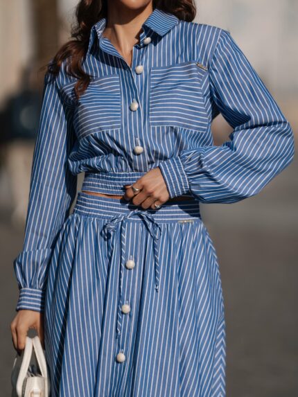 O design distingue-se pelas aplicações brilhantes, que acrescentam um apontamento sofisticado e diferenciador, criando um efeito luminoso e elegante sem excessos. O modelo apresenta mangas compridas, aperta à frente com botões discretos e conta com bolso aplicado no peito, equilibrando na perfeição o lado elegante com um toque casual chic.