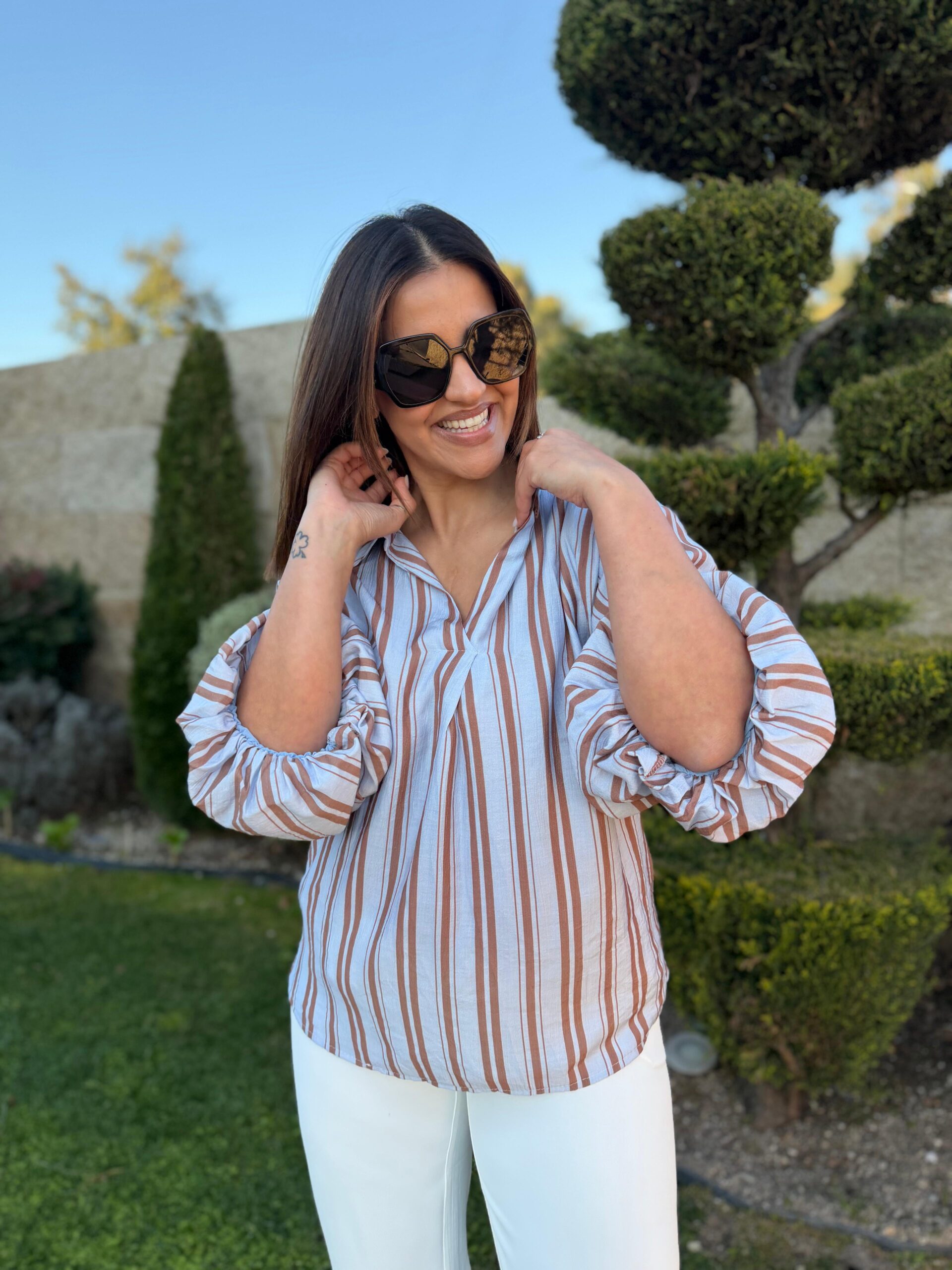 Esta camisa azul com risca castanha destaca-se pelo seu design elegante e contemporâneo, combinando um padrão clássico com um corte moderno e feminino. Confeccionada num tecido leve e confortável, apresenta riscas verticais em tom castanho sobre fundo azul claro, criando um efeito visual que alonga a silhueta e acrescenta sofisticação ao look.