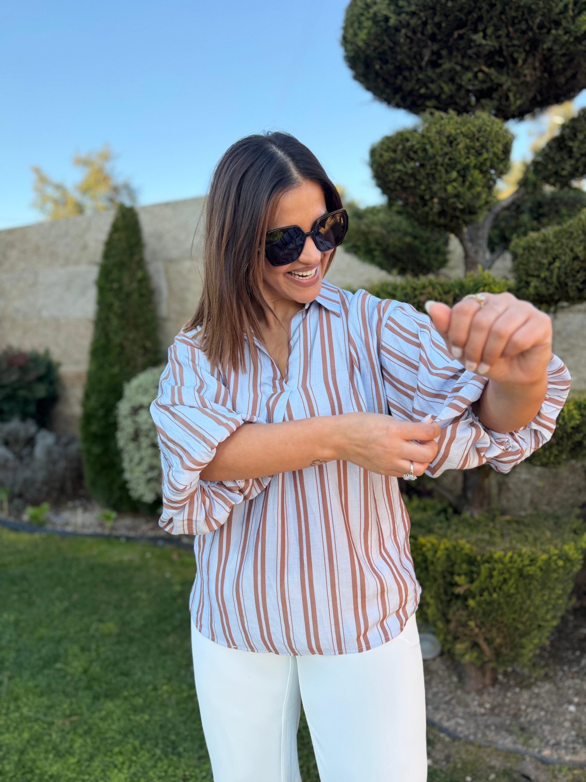 CAMISA BEGE COM RISCA AZUL MARINHO E MANGA ABALONADA PONTO CHIC