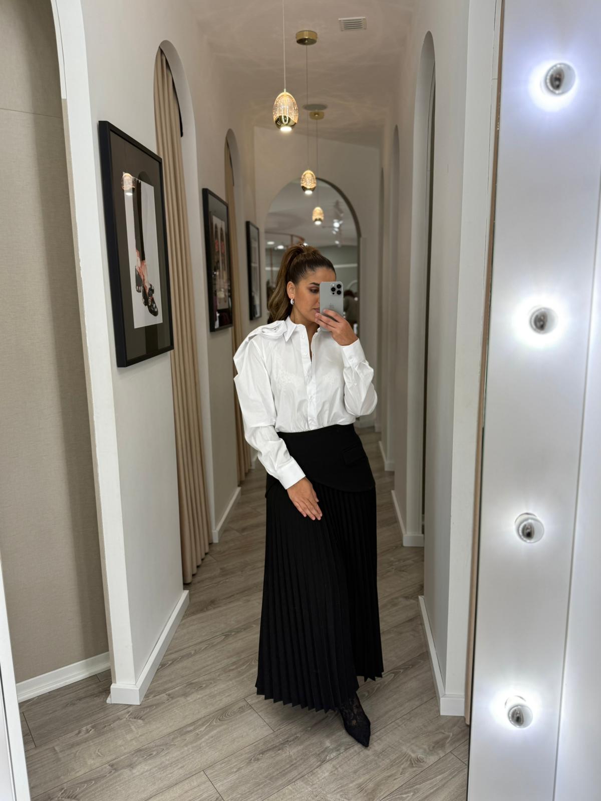 O destaque absoluto da peça é a aplicação floral tridimensional na ombreira, um trabalho de tecido esculpido que adiciona volume, sofisticação e um toque couture, transformando a camisa num statement moderno. A gola tradicional, os botões frontais e os punhos estruturados equilibram a ousadia com a estética clássica.