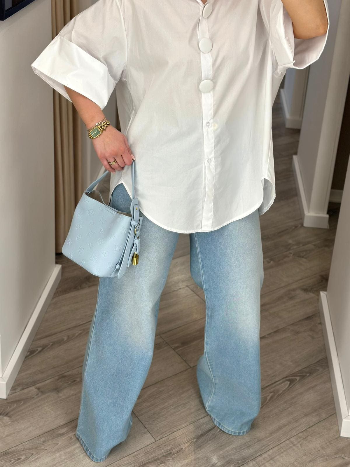 CAMISA DE GANGA AZUL COM BOTÕES JOIA E DETALHE EM CONTRASTE MISS YOU