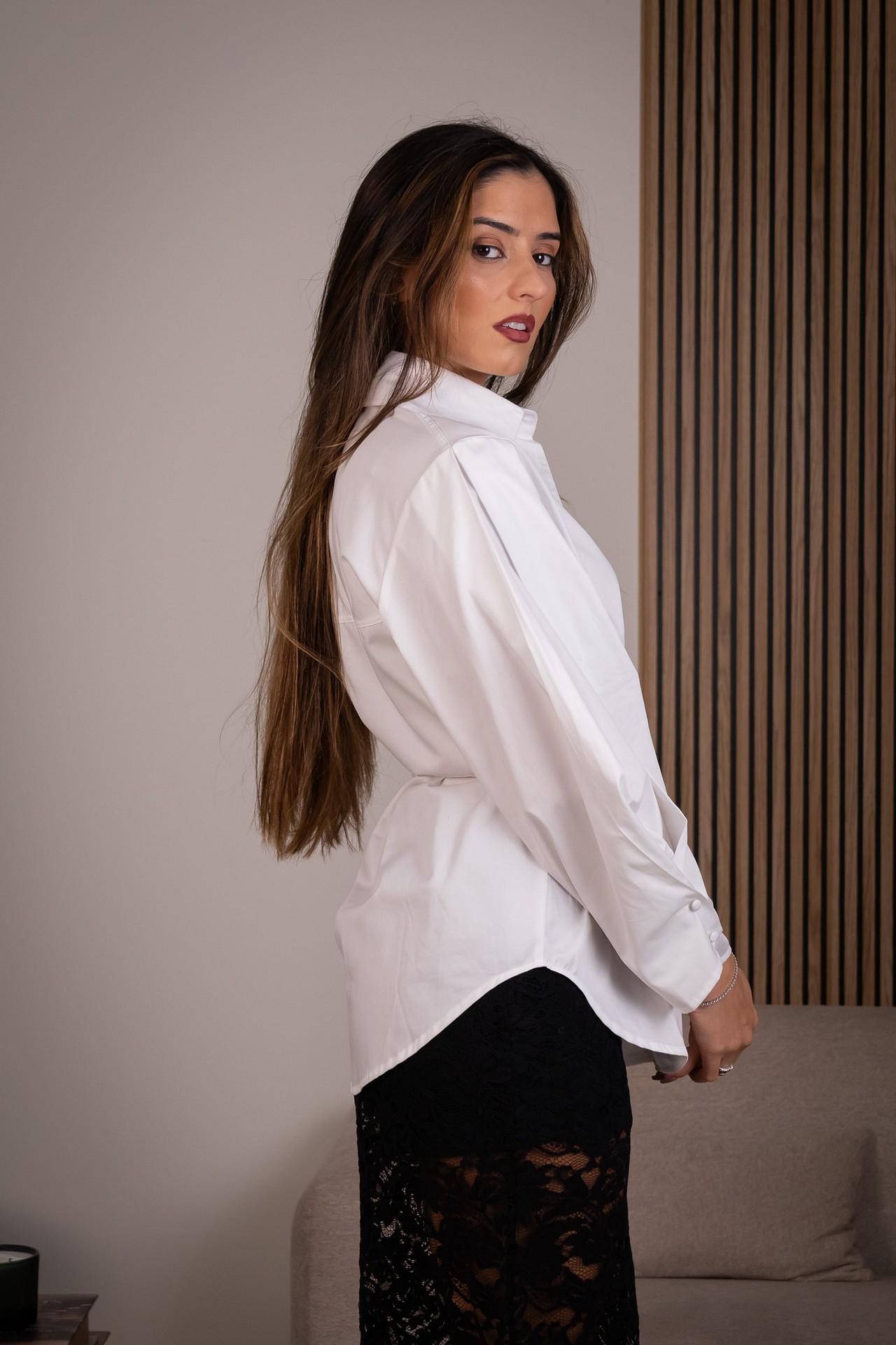 Versátil e intemporal, a camisa branca Sahoco adapta-se facilmente a qualquer ocasião — do escritório a um jantar casual — e é a base perfeita para coordenados elegantes e femininos. Uma peça essencial que traduz o equilíbrio perfeito entre minimalismo e personalidade.