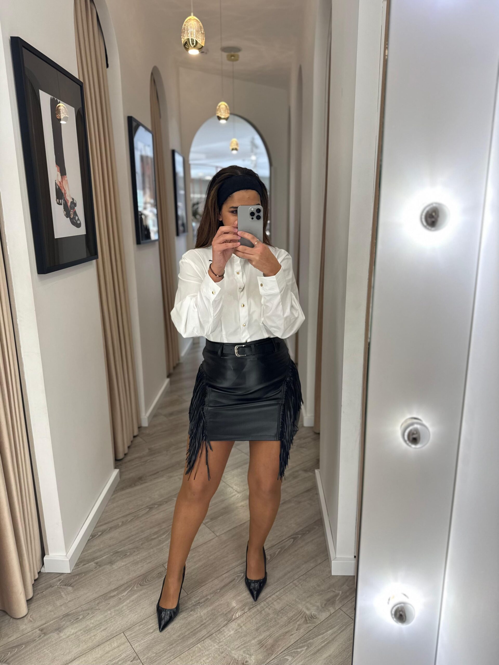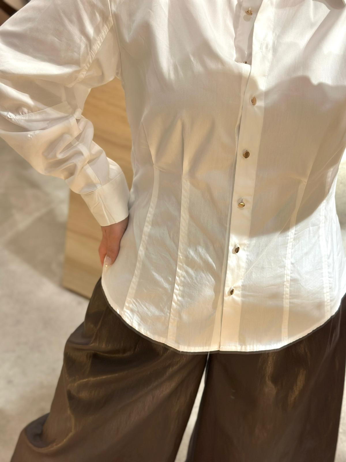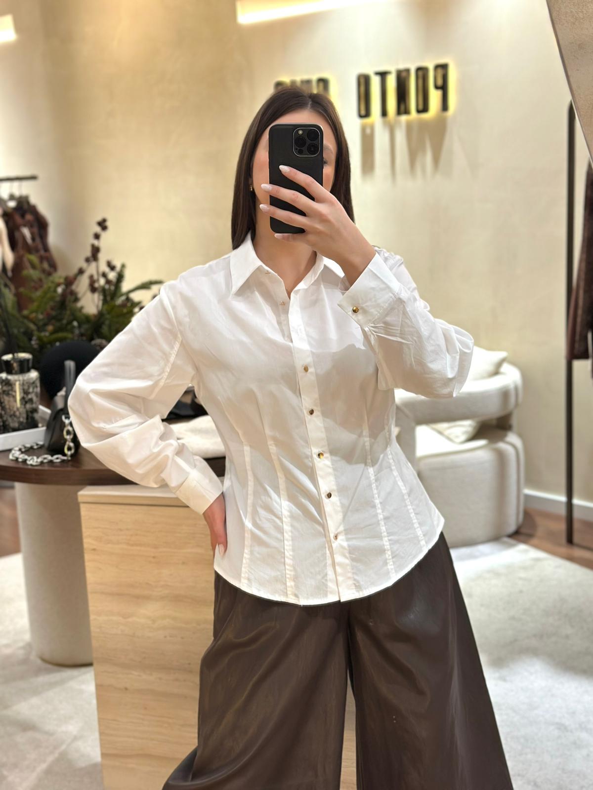 O design apresenta uma estrutura ligeiramente ajustada na zona do tronco, criando um efeito elegante sem perder fluidez. As mangas compridas com volume subtil acrescentam personalidade à peça, enquanto os punhos estruturados reforçam o carácter sofisticado. O fecho frontal é composto por botões dourados discretos, que elevam o visual e criam um contraste delicado com o branco puro do tecido.