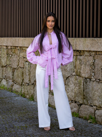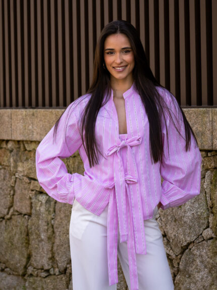CAMISA ROSA BEBÉ ÀS RISCAS COM LAÇOS PONTO CHIC