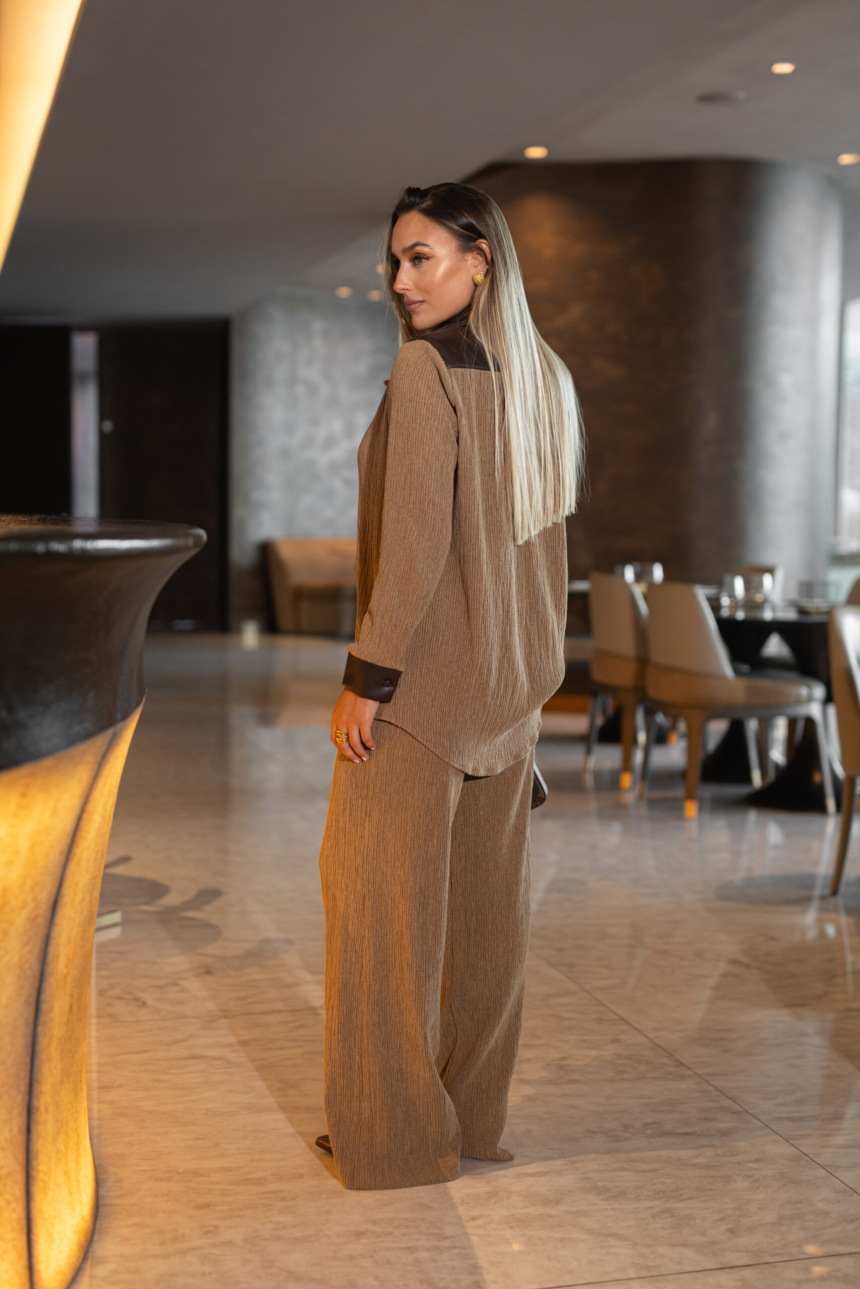 A camisa canelada da marca Miss You combina sofisticação e modernidade através do contraste de texturas. O corpo em malha canelada bege garante conforto e leveza, enquanto o colarinho e a pala dos ombros em efeito pele adicionam um toque contemporâneo e irreverente.