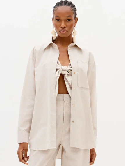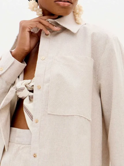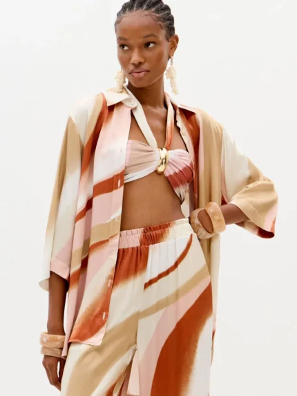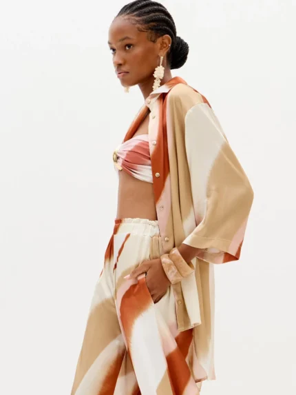 Esta camisa em tom castanho é a combinação perfeita entre sofisticação e irreverência. O corte clássico de colarinho e botões frontais ganha uma nova vida com o detalhe assimétrico e o drapeado na parte inferior, que criam movimento e originalidade ao look. Uma peça versátil que pode ser usada tanto em coordenados de escritório como em produções mais arrojadas para sair à noite.